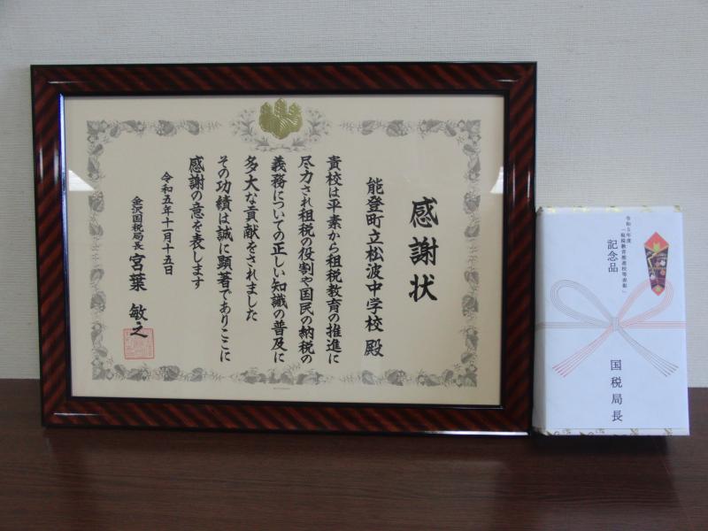 本日、輪島税務署長がご来校され、生徒たちの表彰に先立ち、松波中学校が訪問表彰を受けました。租税教室の開催や税に関する作品応募の功績を評されたものです。今年度の作品応募の結果、輪島税務署管内で松波中3年生4名が、会長賞をはじめとする表彰を受ける予定になっています。(入賞者の紹介は後日いたします。)