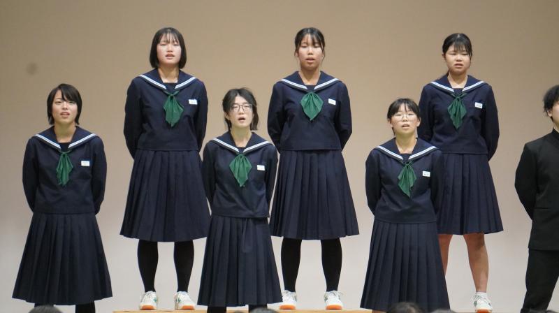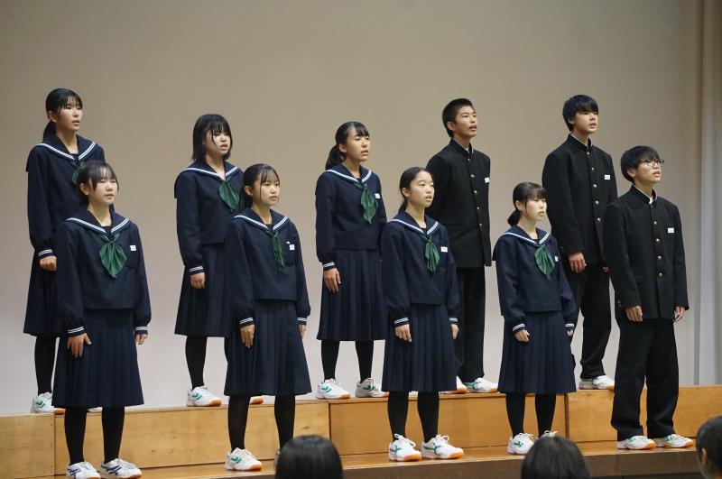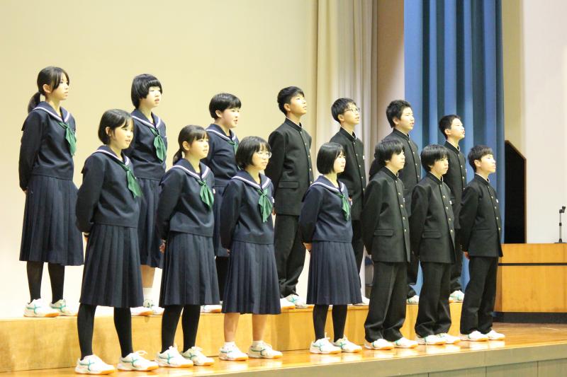 本日午後、能登中学校で、能登町の中学1年生全員が集合し、標記集いを開催しました。リコーダー合奏では、松波中のエリアから美しいメロディが響いていました。全員合唱では、声の響きに驚き楽しみながら笑顔で歌う姿が印象的でした。後半は、Ki-mama Saxophone Ensembleの演奏を堪能しました。