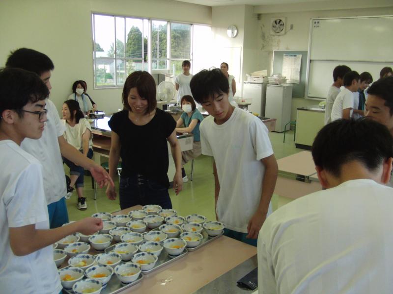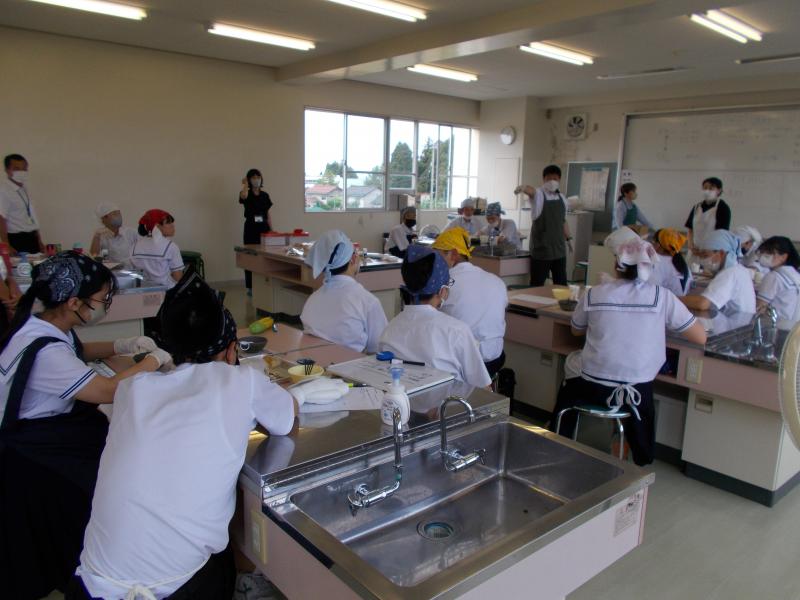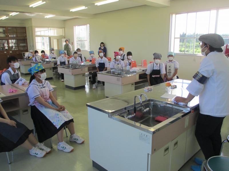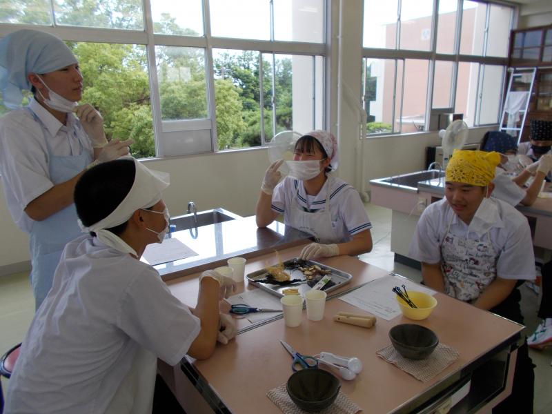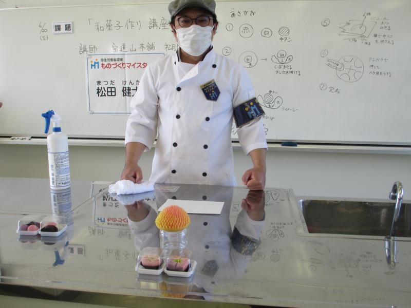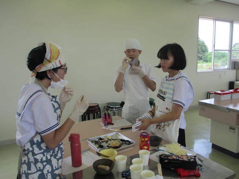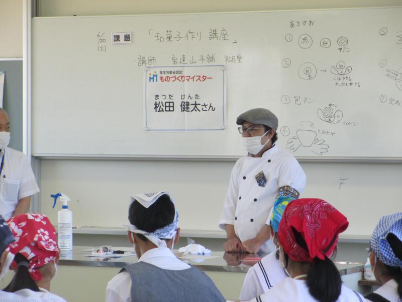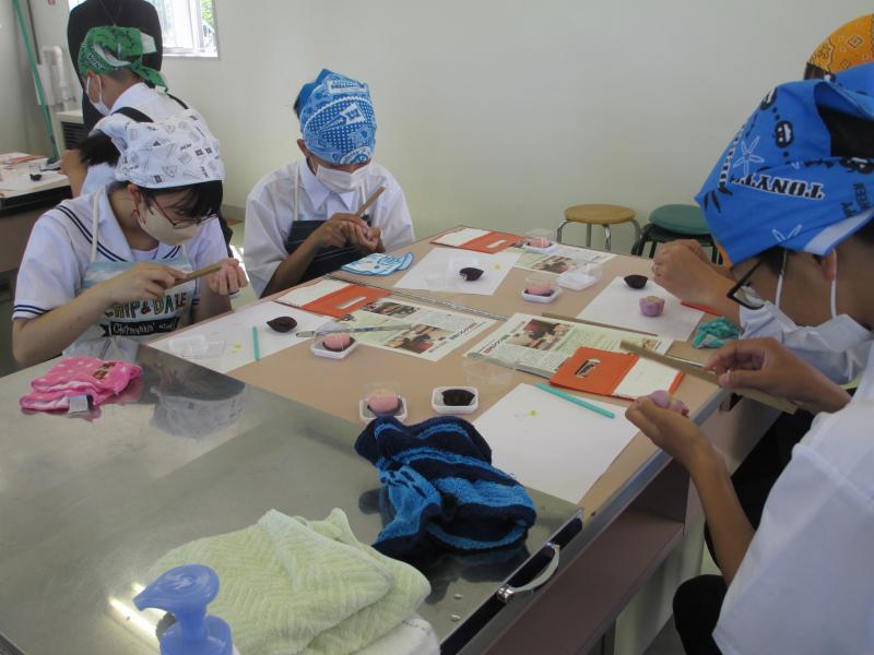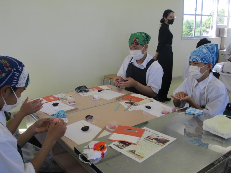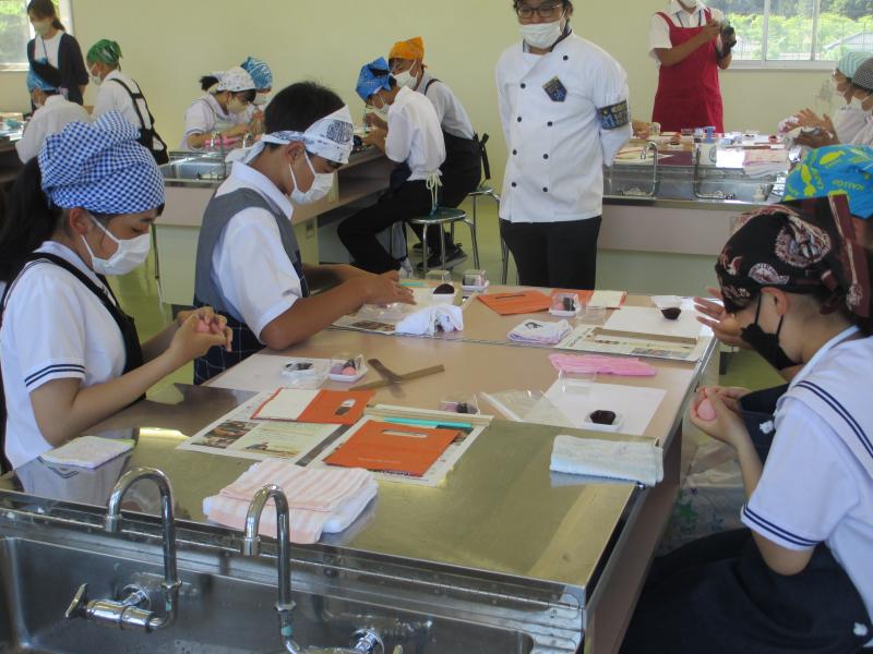石川県職業能力開発協会にお世話いただき、1・2年生家庭の授業の一環として「和菓子つくり」に挑戦しました。講師として、厚生労働省認定ものづくりマイスターの松田健太さん(宝達山本舗松月堂三代目…宝達志水町)にご来校いただき、「あさがお」「あじさい」の2種類の和菓子づくりを体験しました。松田先生の実演では、包あん・もみあげで形を整えた後、へらで軽く抑えただけで朝顔や紫陽花の花が現れ、調理室が「おぉ~」という歓声、拍手に包まれました。ご指導のおかげもあり、生徒たちもなんとかあさがおとあじさいを咲かせることができたようです。
