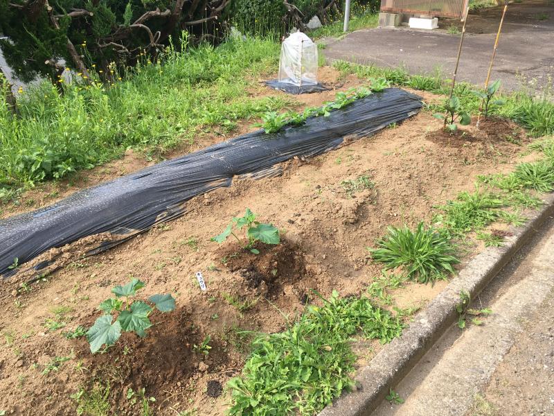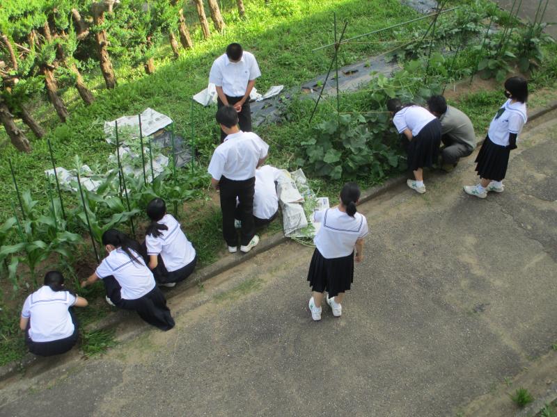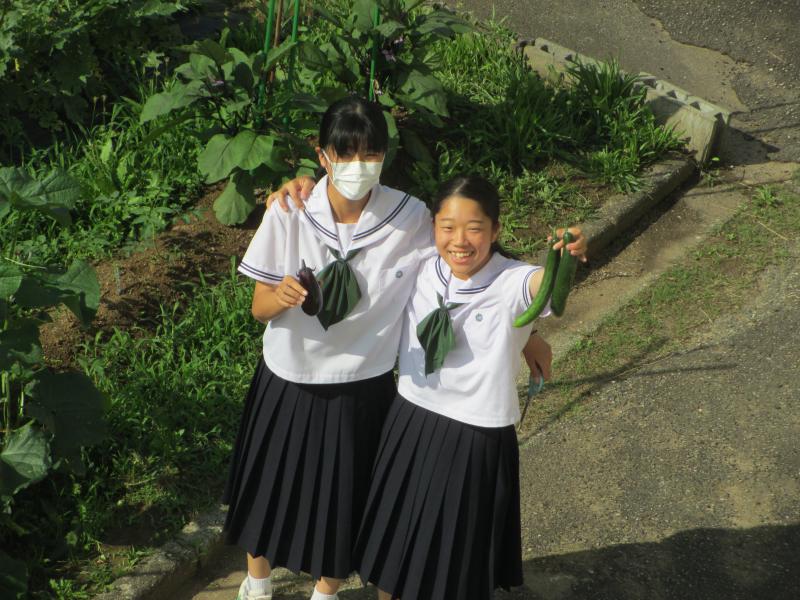 学校菜園ではすでに少しずつ収穫が始まっています。朝、野菜の様子を見に来た生徒たちに声をかけたらポーズをとってくれました。午後の授業では、除草や間引きをしました。