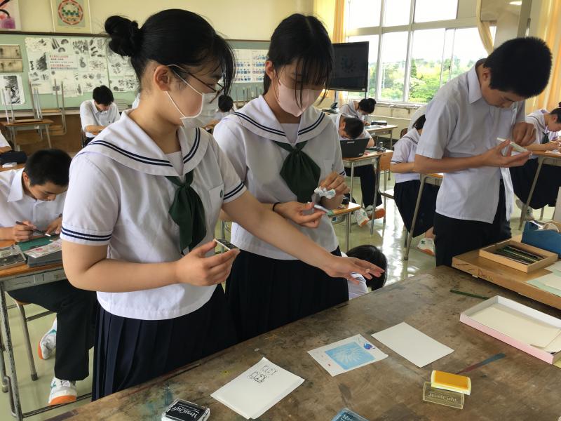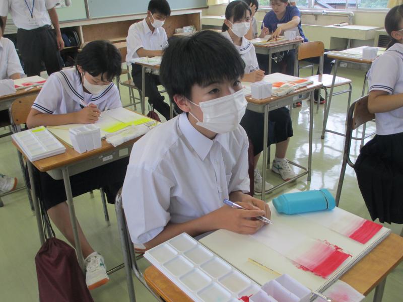 指導主事の先生をお招きして、1年生美術の授業研究をしました。ポスターカラーの有彩色1色と白のグラデーションを描く勉強をしました。生徒たちは今後、相手意識を持った作品の創作に挑戦していきます。
