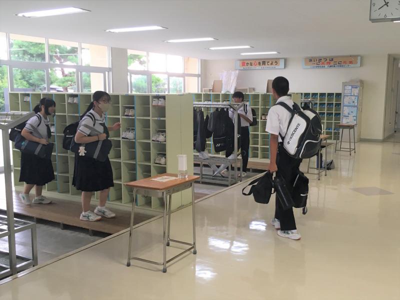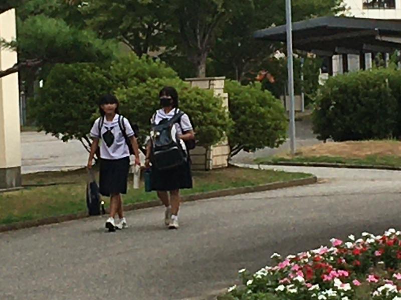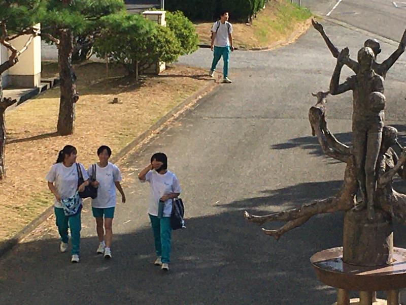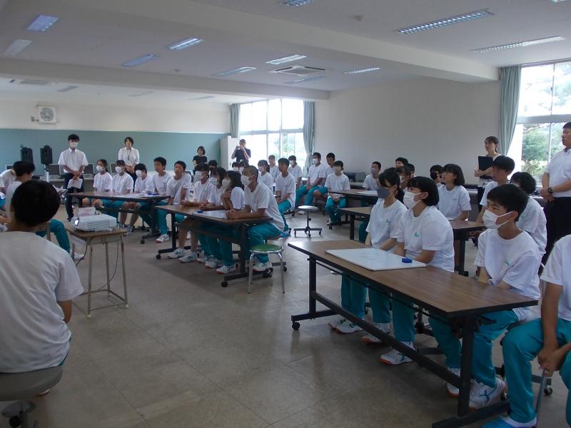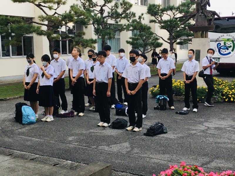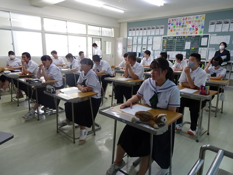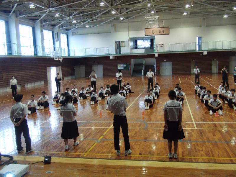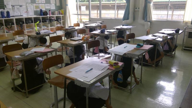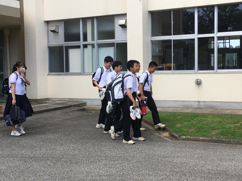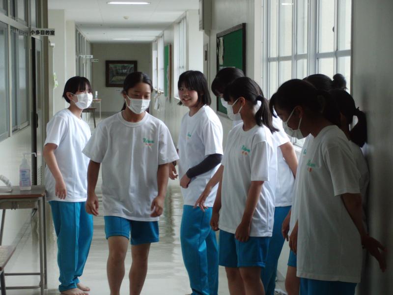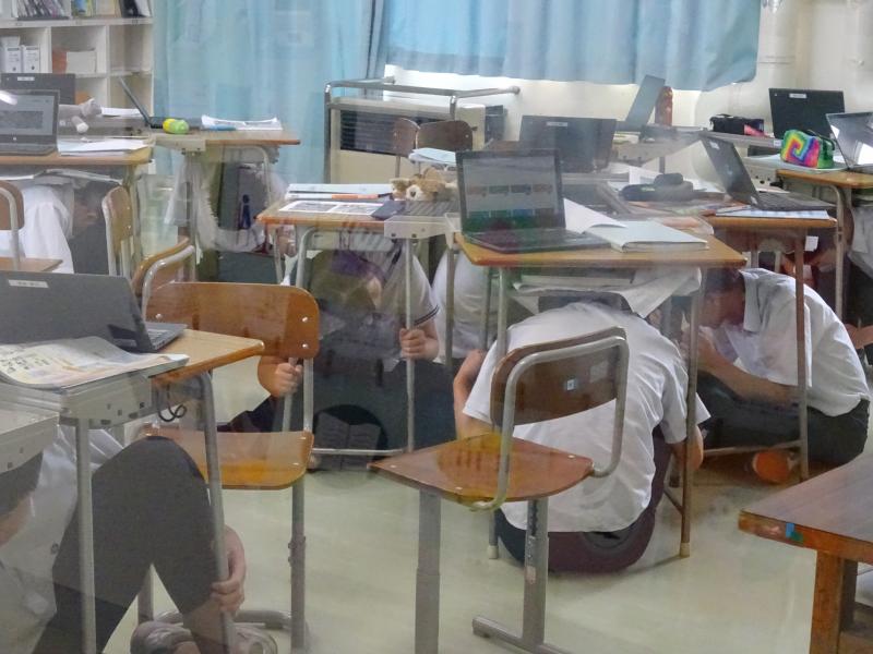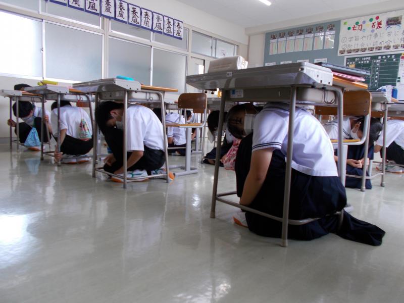 県下一斉の避難訓練です。生徒たちは、小学校からの積み重ねで、自分の身を守る一次避難は見事に行動できています。群発地震はまだ続いています。常に備えて学校生活を送ります。