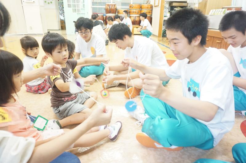 3年生家庭科「幼児の生活と家族」の学習の一環で、幼児と触れ合うおもちゃや絵本を手に、松波こども園を訪問させていただきました。多くの生徒が通ったこども園でもあり、先生方にも暖かく迎えていただきました。ビュンビュンゴマや釣り遊び、的あてなどで年長さんと年中さんをと一緒に遊んだ後は、手つなぎの輪くぐりで競争しました。普段学校では見れない本当に無邪気な表情をたくさん見せた3年生でした。初めの挨拶やお別れの挨拶では、中学生としての成長も見せました。