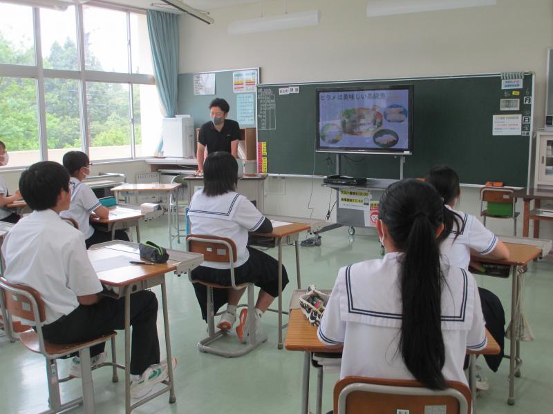 能登里海教育研究所から松本さん、能丸さん、そしてフードコーディネーターの瀬川さんをお招きして、「オリジナルふりかけ」の商品開発についてお話を聞きました。能登町の資源を活用するということから、自分たちの地元ではどんな海藻や野菜が採れるのかを学び、そこから商品を開発するということへの不安や期待を抱いていました。