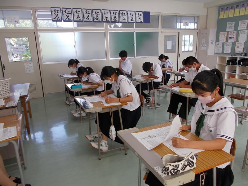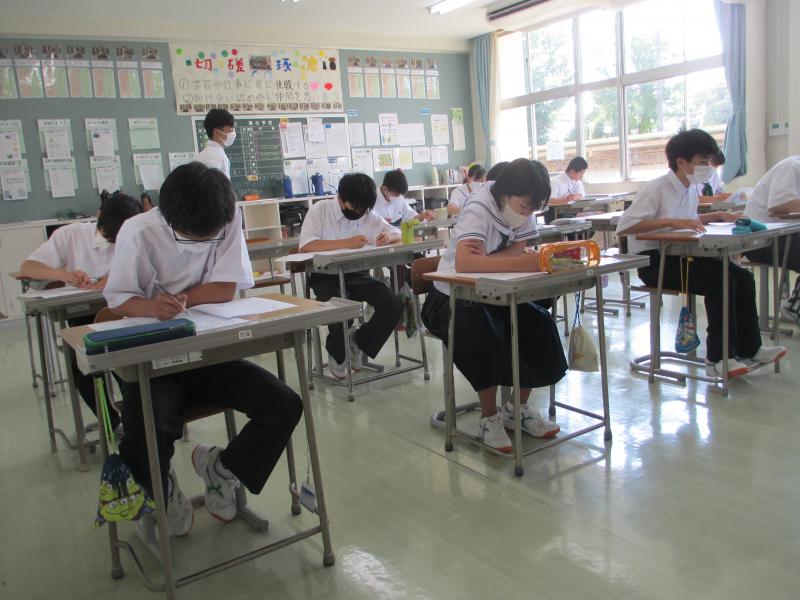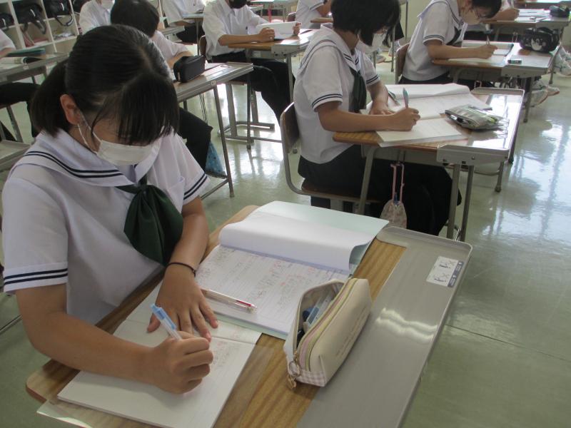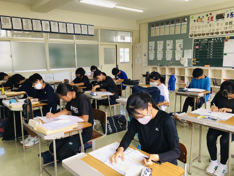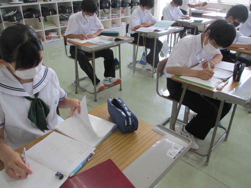 1年生は登校後すぐに友達と問題のやり取りを始めていました。朝自習の時間には多くの生徒が自学ノートに最後の追い込みを書き込んでテストに備えようとしています。頑張れ松中生! (写真は1年生の様子です)