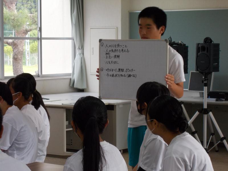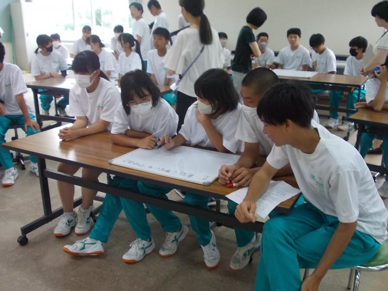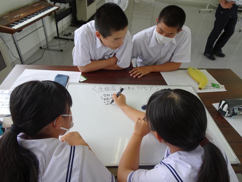 7月6日(木)の午後からは、前日行われたファシリテーション研修の2日目が行われました。委員会ごとに話し合った「松波中をもっと豊かにするための委員会わくわくアイデア」について、それぞれのアイデアを発表しました。昨日話し合った「やってみたいこと」から、少し現実的な視点「①みんなが楽しめる ②安全にできる ③休み時間に行う ④費用をかけない」で、さらにアイデアを絞り上げていきました。校長先生から、良いアイデアは実現させましょう、という提案もあり、生徒も意欲的に話し合っていました。