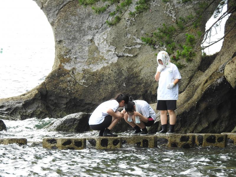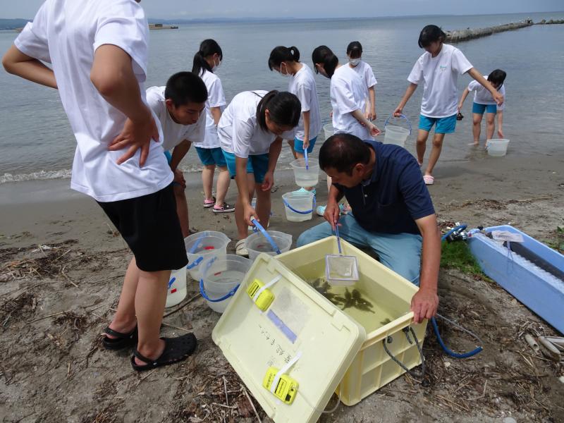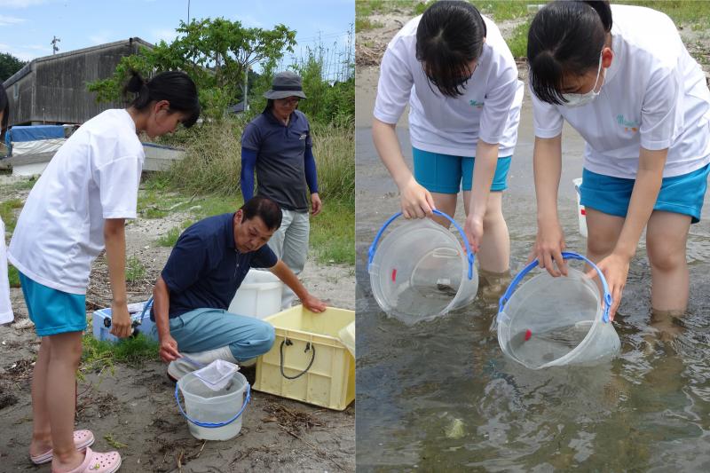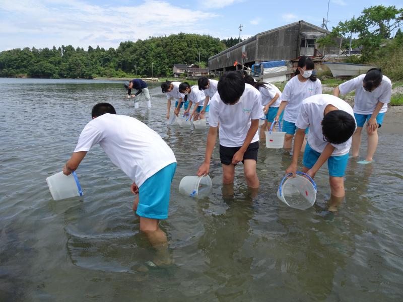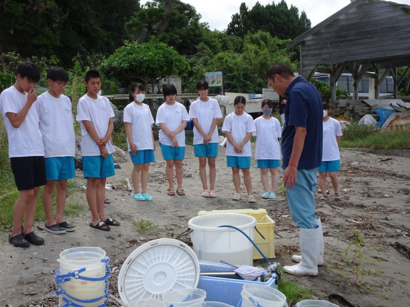2年生が6月30日から飼育していたヒラメの稚魚を空林の海岸で放流しました。毎朝、2年生ばかりでなく、1・3年生もヒラメの様子を観察していました。