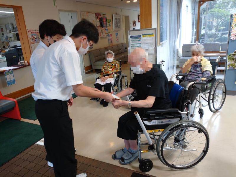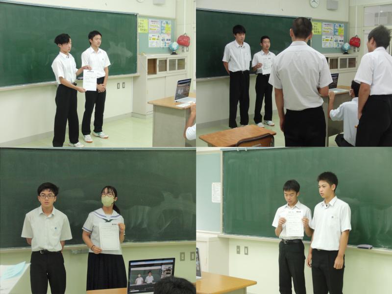 生徒会図書文化委員会委員長:出島秀真さん(3年)、同書記:垣内律希さん(3年)が代表して第二長寿園を訪れ、先に行った暑中見舞いコンクールの作品をお届けました。自治会長さんに受け取っていただき、丁寧なごあいさつも頂きました。生徒たちの作品が少しでも皆様の笑顔につながれば幸いです。お体には気をつけてお過ごしください。(入選作品は、後ほどホームページに掲載いたします)