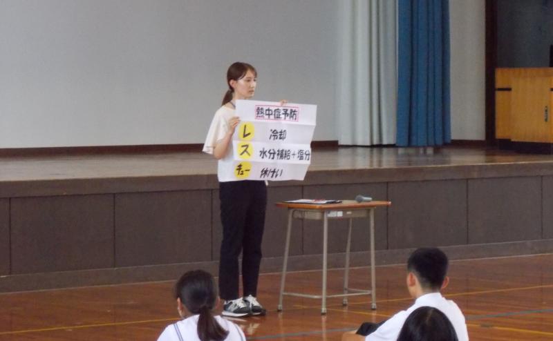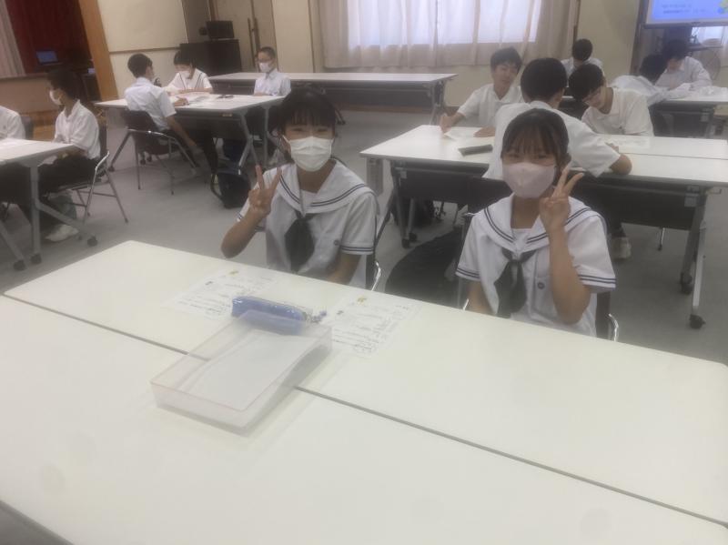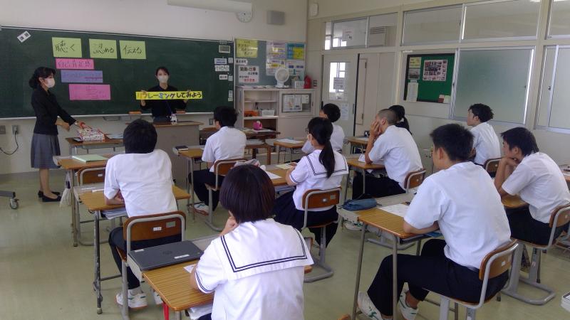 ちょっとした言葉のやりとりが誤解を生みやすい年頃です。自分の気持ちを言葉にして正しく伝えるスキルについて、スクールカウンセラーの紺谷先生から、2年生に向けてお話をしていただきました。朝のホームルーム前の15分間を利用しました。途中、養護教諭も加わり、伝わり方の違いをロールプレイで確かめました。客観的にその様子を見て、うなずきながら聞く2年生でした。