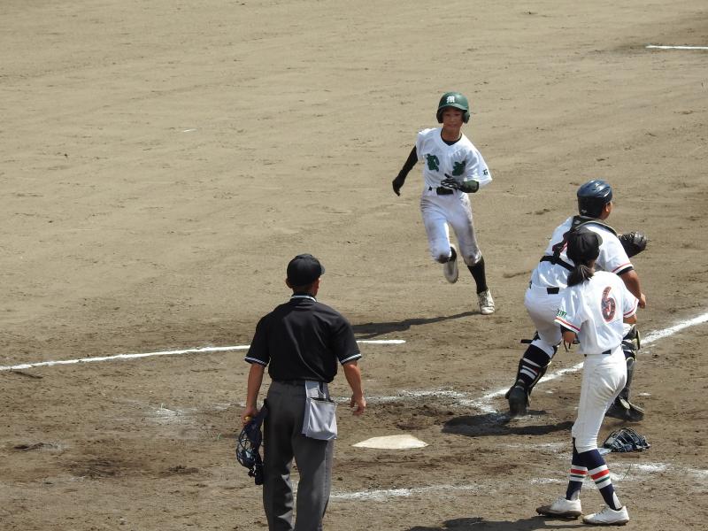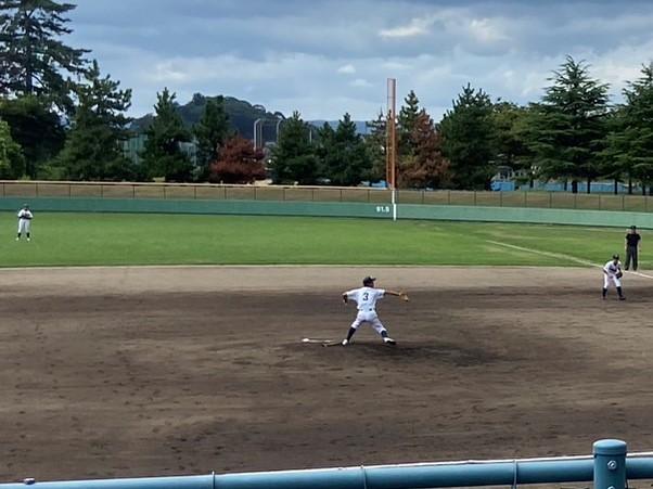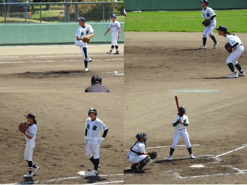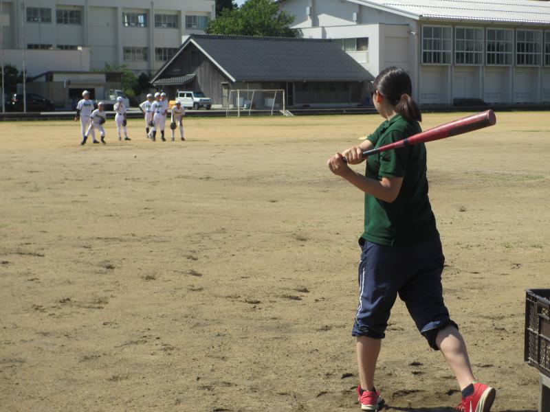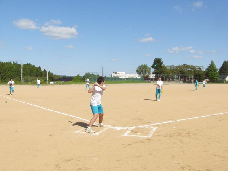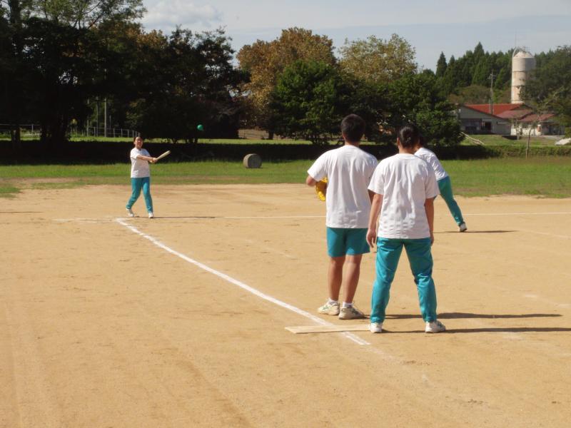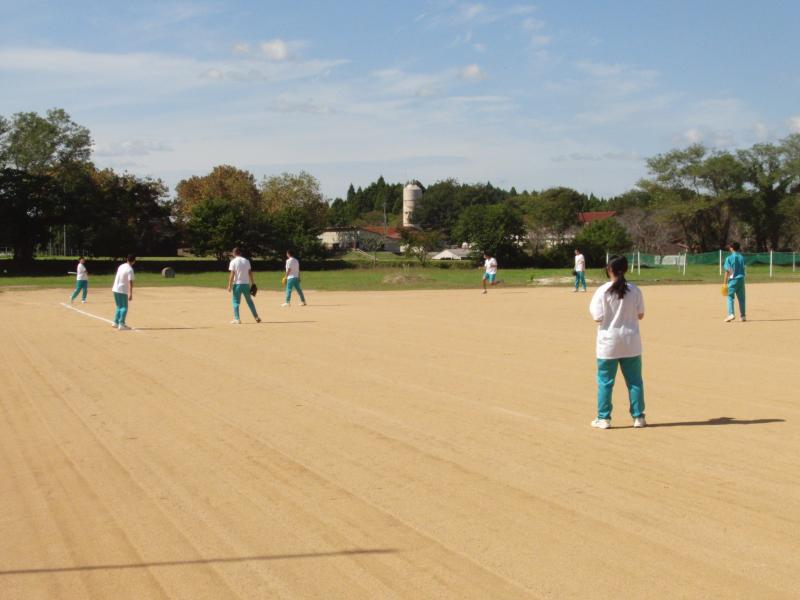 快晴の空の下、保健体育の授業で、3年生がソフトボールの試合を楽しんでいました。結構な接戦になっていました。