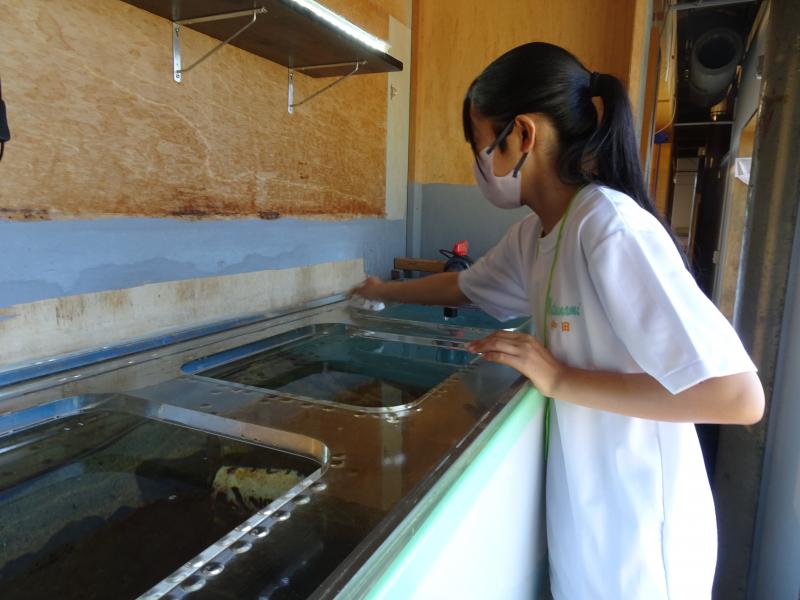 水槽生活にも慣れてきたか、定期のエサやりでは稚魚たちが競ってエサに飛びつきます。来週7月13日(木)に空林の砂浜で稚魚を放流予定です。62匹の稚魚を預かったのですが、1匹でも多く放流できるよう生徒たちは愛でながら観察をしています。