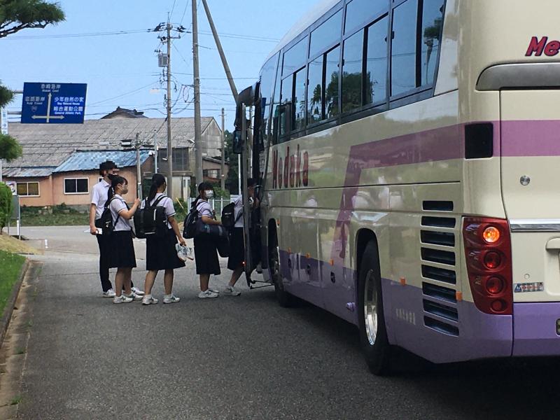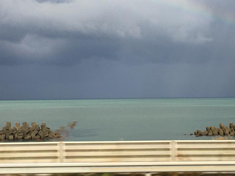 曇り空にかかる虹や日本海の綺麗な緑色にいちいち歓声が上がるバス車内です。文化祭の合唱曲が流れると歌声も響きます、