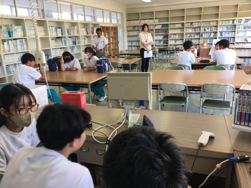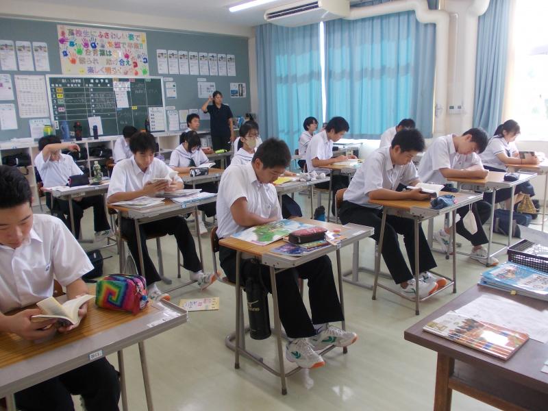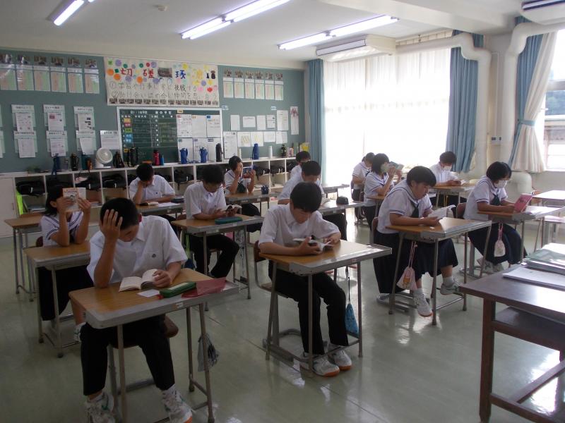 以前は、全校集会で委員会の代表が方針や具体的な取組を発表したり報告したりしていましたが、今朝はオンライン報告です。全校生徒の移動時間がない分、報告が終わったら各学年すぐに読書を始めることができました。
