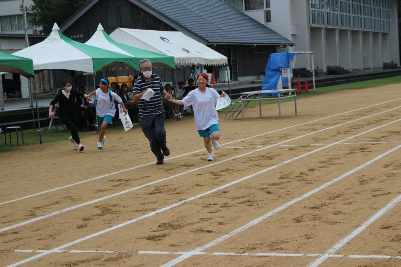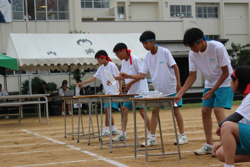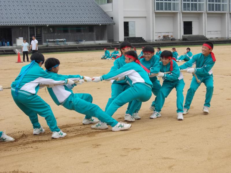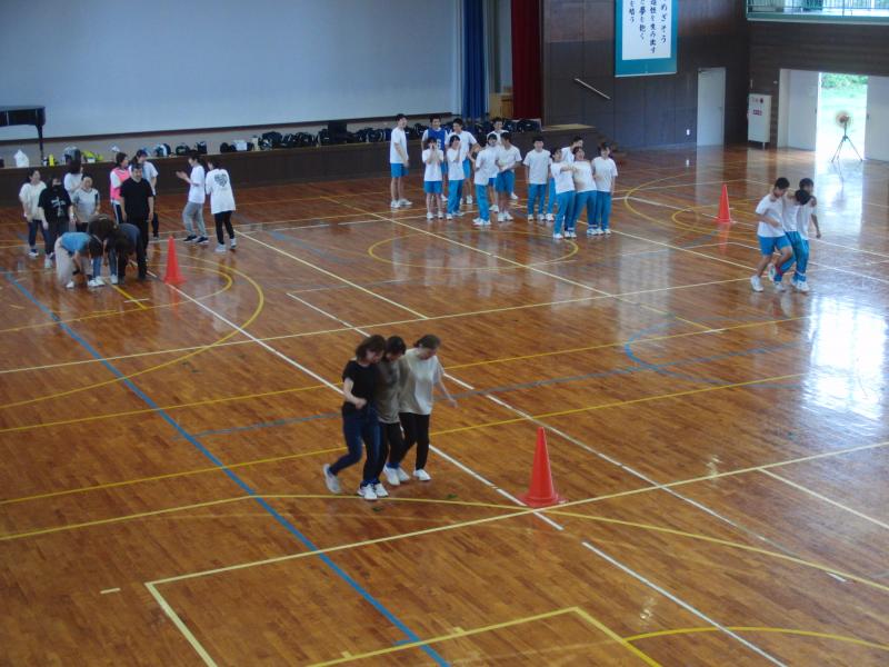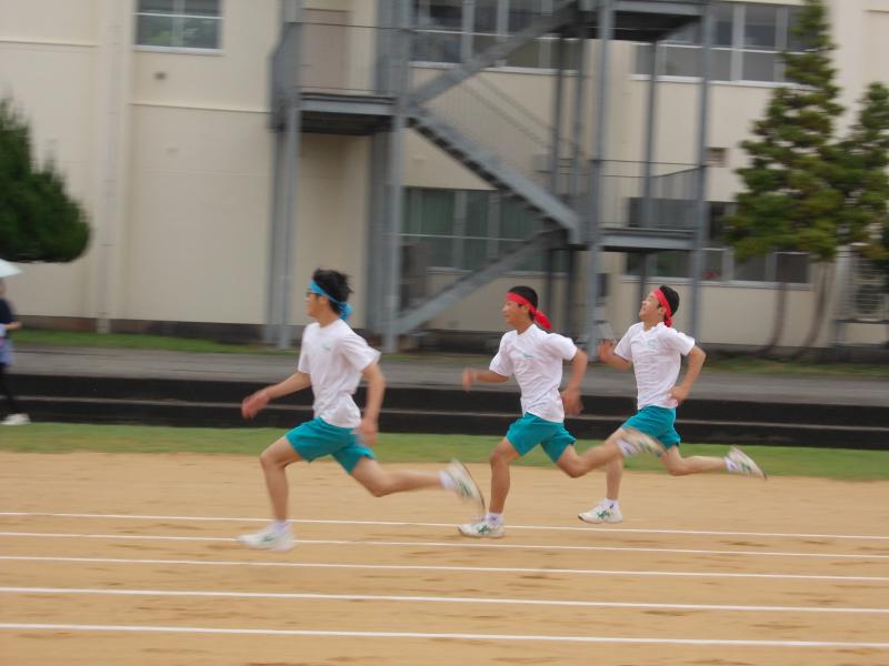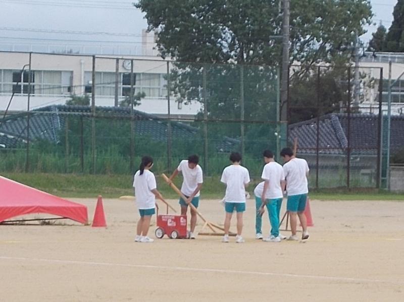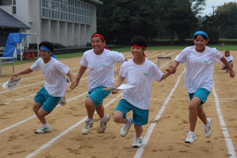 体育祭中盤、二人三脚と綱引き(場所交代=ハイタッチ?)の様子です。