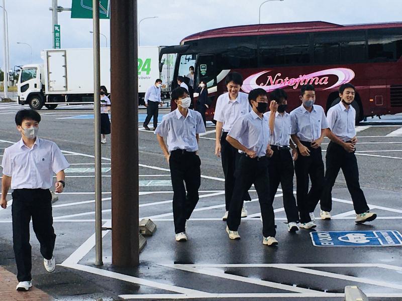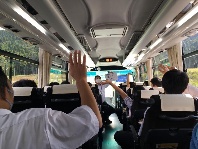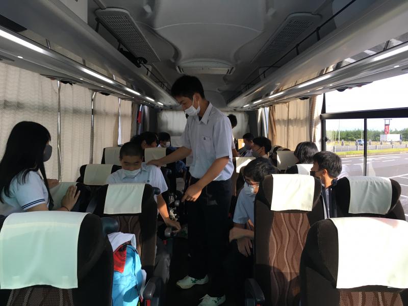 最初の休憩です。慣れない長時間のバス移動に、降車に安心した表情の生徒も数名。