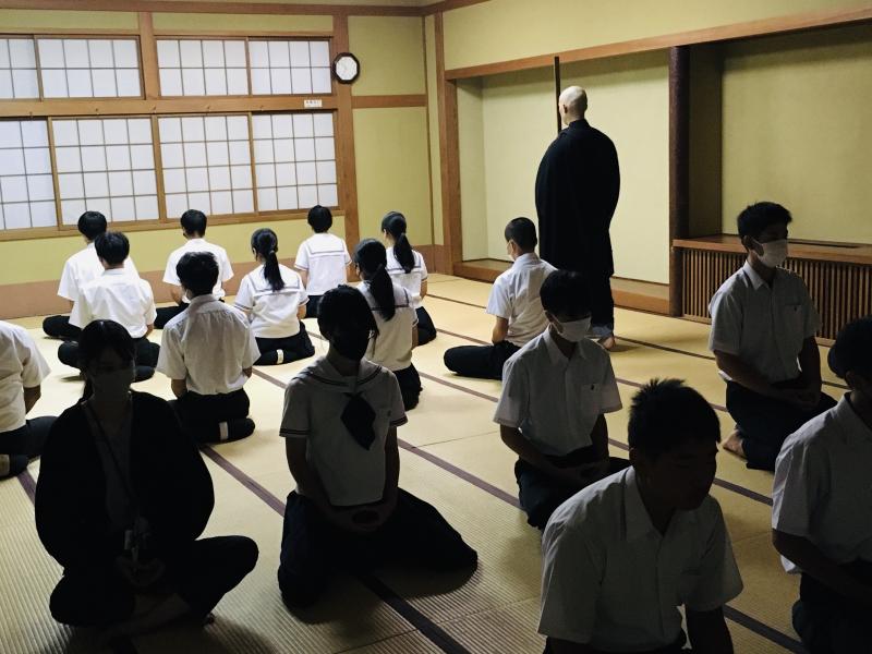 雲の切間を利用して集合写真撮影。最初に坐禅体験です。静かに修行僧の方のお話を聞きながら、体を整えています。