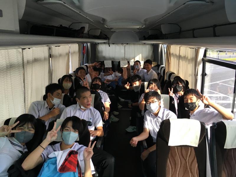 3年生、元気な表情で修学旅行に出発しました。バスの中ではリクライニングを少し倒してリラックスモードです。