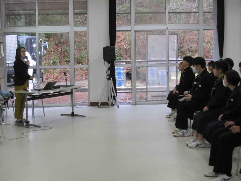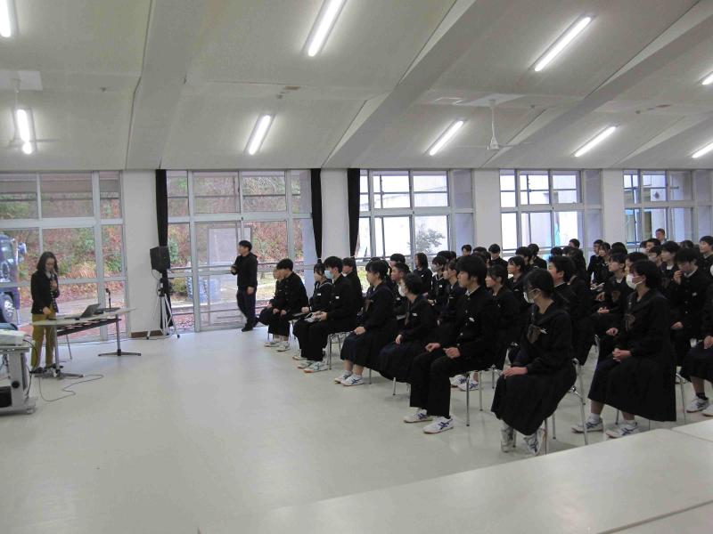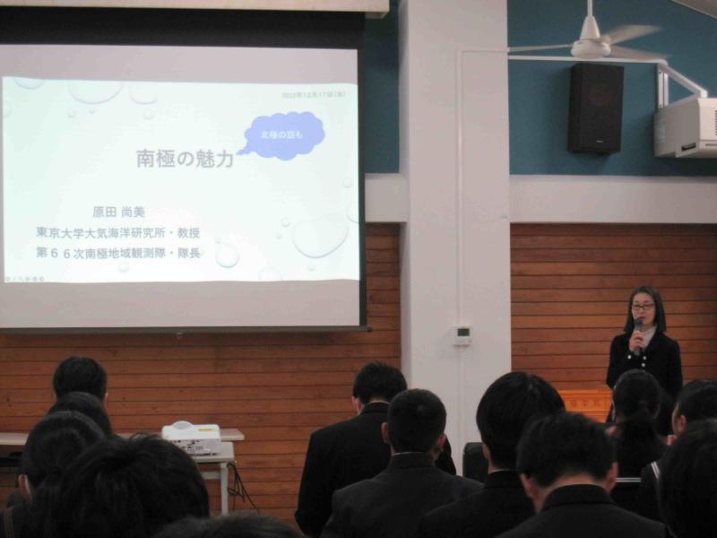 海洋教育の一環で、毎年大学教授をお招きし、海に関するお話を聞いています。今年は、2年生が柳田中学校と合同で、東京大学の原田尚美教授から、「南極と北極」「第66次南極観測隊の経験から」と題して、科学的なデータや観測隊として南極に行かれた経験を交えて、たくさんの貴重なお話を聞くことができました。最後に先生から「今、自分がいる場所が全てではなく、地球規模で考え行動してみよう」と、メッセージをいただきました。また、生徒からのたくさんの質問にも丁寧に答えていただき、ありがとうございました。