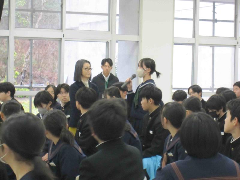 能登町復興計画、総合計画に「子どもの声」を反映させる目的で、金沢大学の学生による生徒へのヒアリングがありました。2年の生徒会執行委員と2年学級代表の4名が参加し、能登町(松波地区)の好きなところや自慢のもの、不満に思っていることを考え、その理由を自分たちの言葉で学生の方々に伝えました。