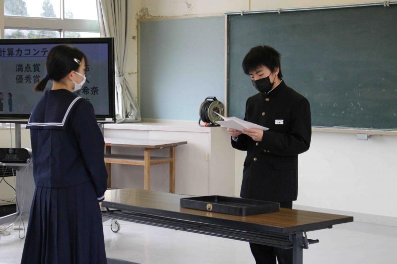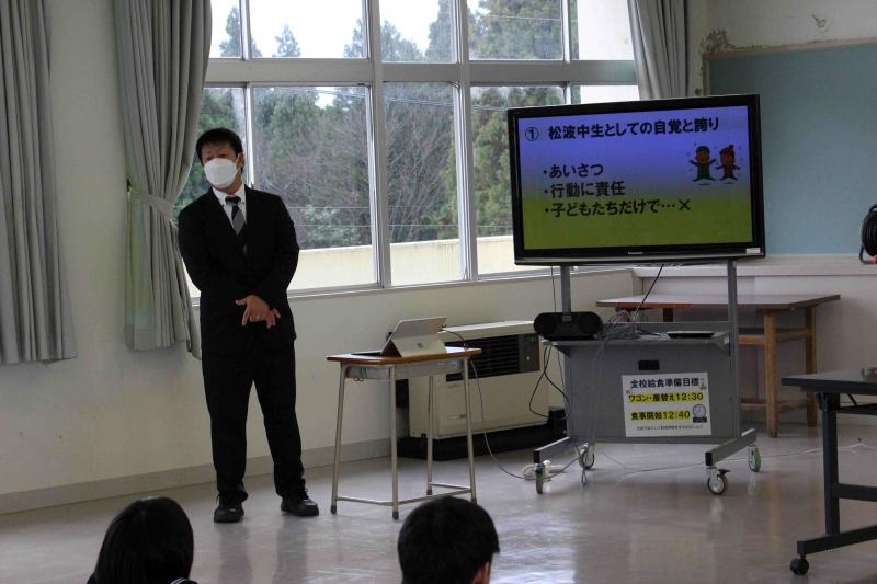 夏休みの応募作品の結果が、続々と届いており、絵画、作文、ポスター、書道作品の表彰を行いました。表彰式がこれからのものも含め、随時結果が届き次第、表彰していきたいと思います。同時に能登地区新人剣道大会の納賞も行いました。文化面、運動面ともに、生徒たちの頑張りが成果につながっています。また、教育実習生の紹介も行いました。