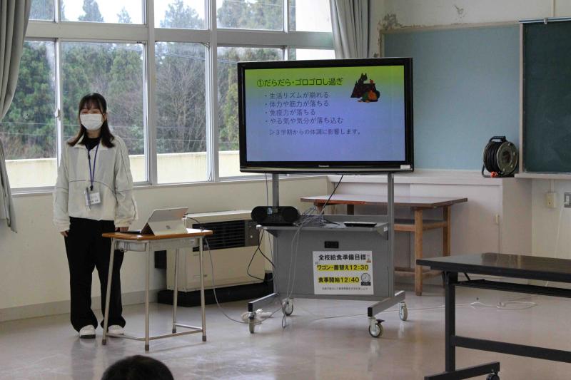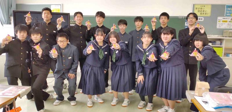 3年生は「のとかけ」の販売をきっかけに、北海道の標津高校の生徒の皆さんとオンラインで交流することができました。それぞれの学校から学習の取り組みを紹介し、地元産の食品を活用した製品作りについて聞きました。高校生の皆さんからの発表では、クイズが出され、それを解きながら楽しんで聞くことができたので、良かったです。また、標津高校では、海産物だけでなく酪農や農作物を活用したものなど、たくさんの製品開発に取り組まれていて中学生にとって、とても参考になることばかりでした。ありがとうございました!