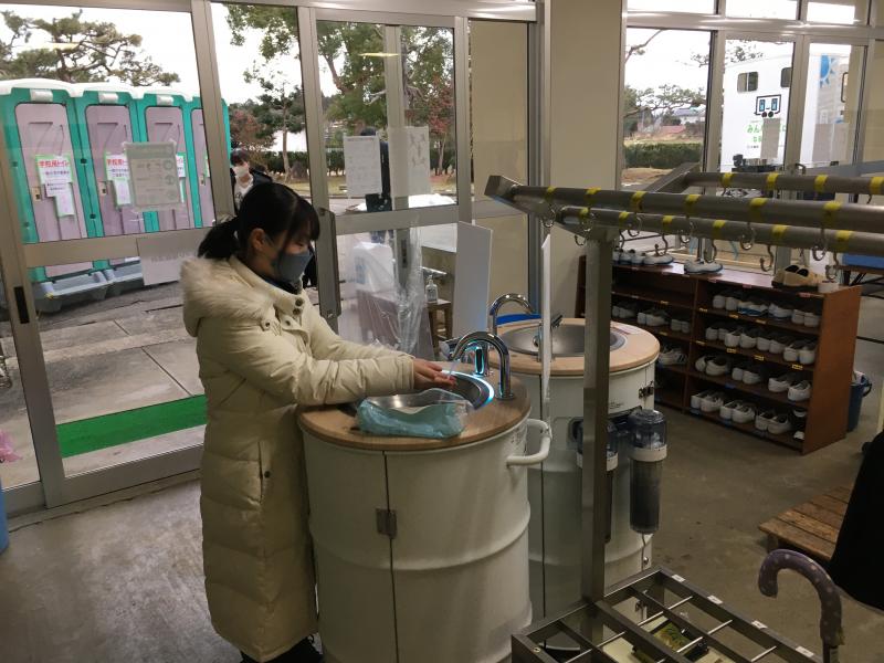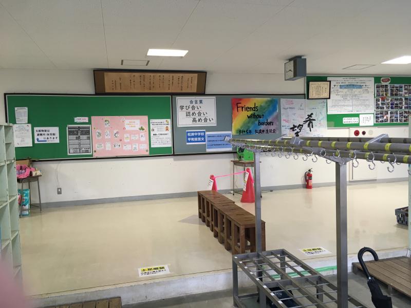 ①児童・生徒は生徒玄関から入館します。外には児童・生徒用の仮設トイレ、中には循環型の手洗い器があります(2台のうち1台は、2階に移設予定です。)。裏面を伝言板として使われていた生徒会掲示は貼り直しました。生徒玄関奥や傘立てには支援物資が並びます。