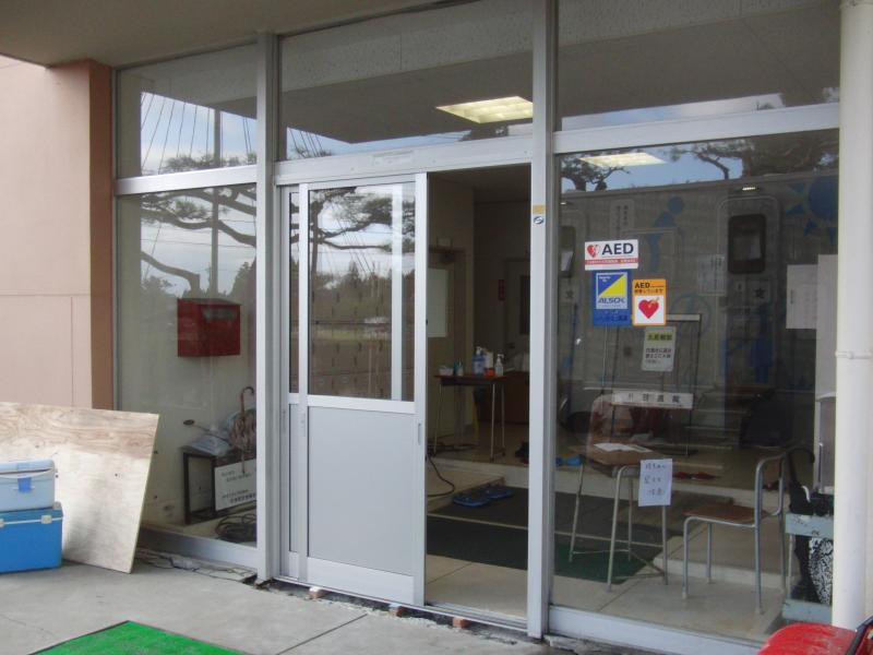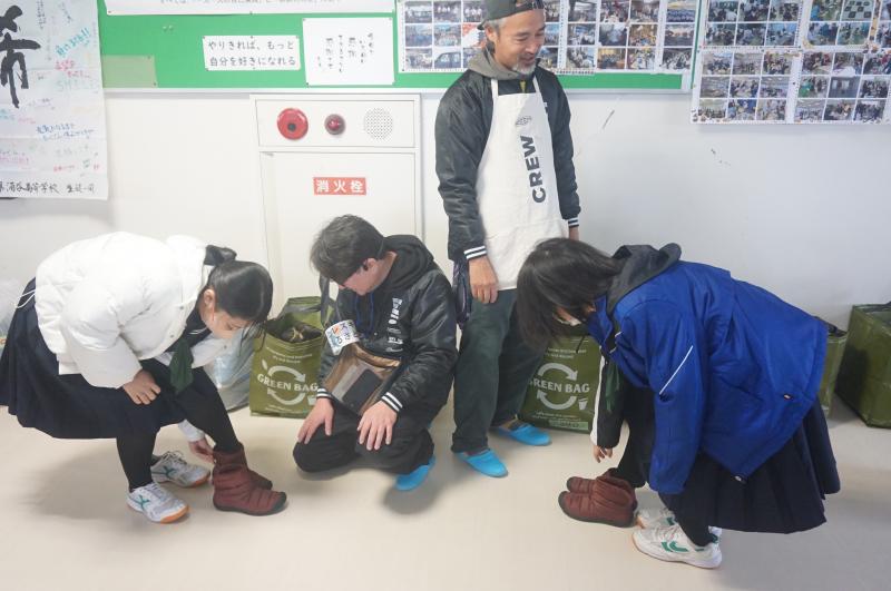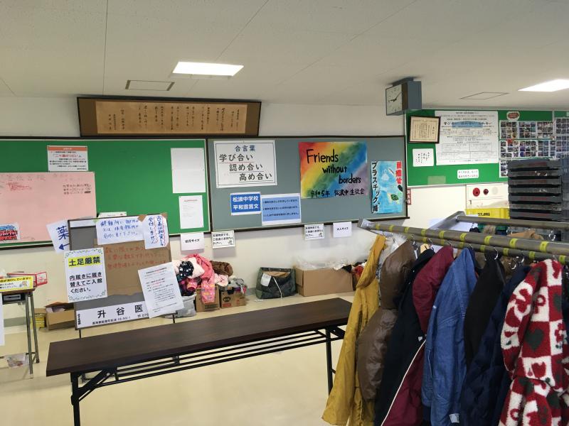 支援物資が生徒玄関の3分の2を占めており、生徒・児童たちは玄関右側3分の1を利用して出入りしていました。宮城県から業務支援に来ていただいている樋口先生に玄関先を整頓していただき、半分を子どもたちのスペースとして確保できました。小学生もゆったり玄関を使えそうです。
