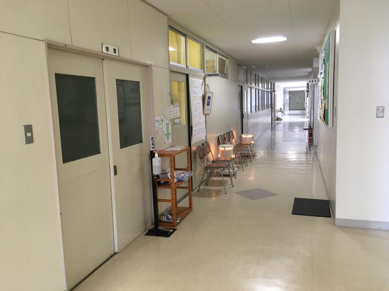 ②教室棟の1階の一室は、現在薬局へ貸し出しています。他の教室は、救護室として待機させています(現在は要救護者はゼロ)。階段より上は児童・生徒のスペースです。