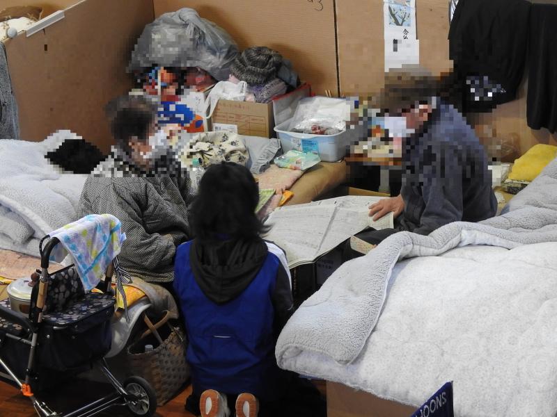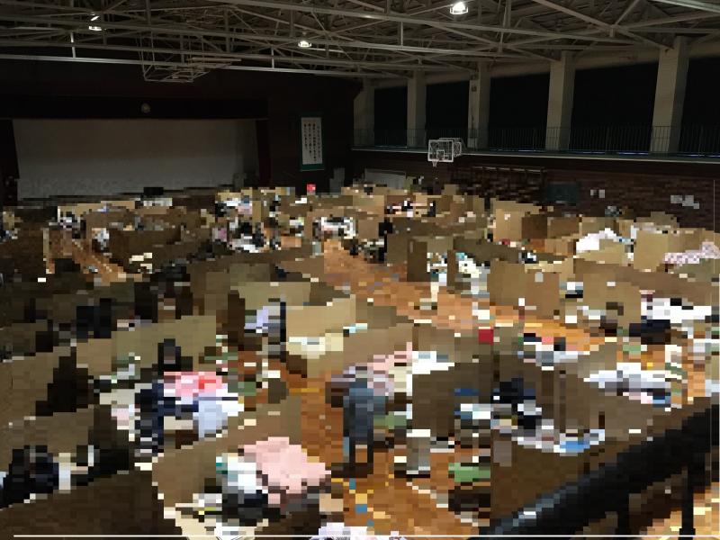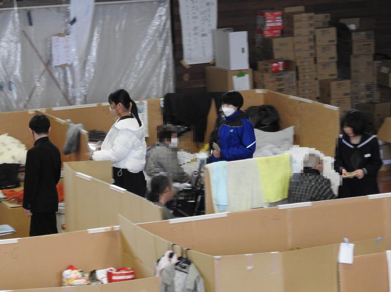 2階~3階は、児童・生徒のスペースです。2階の一部(音楽室。調理室)は入浴支援の自衛隊員が駐留しています。児童・生徒との動線は離しています。