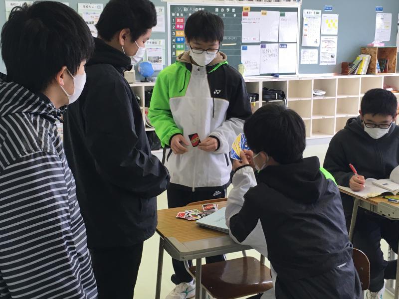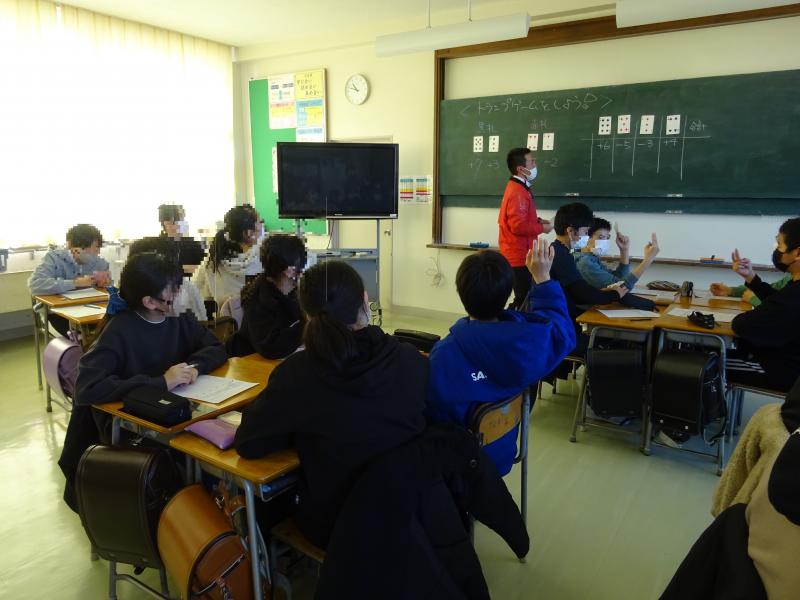 3限目は数学の体験授業で、中学校教諭がトランプを使って正負の数について勉強しました。理解する力があり、すぐに計算ゲームに取り組むことができていました。
