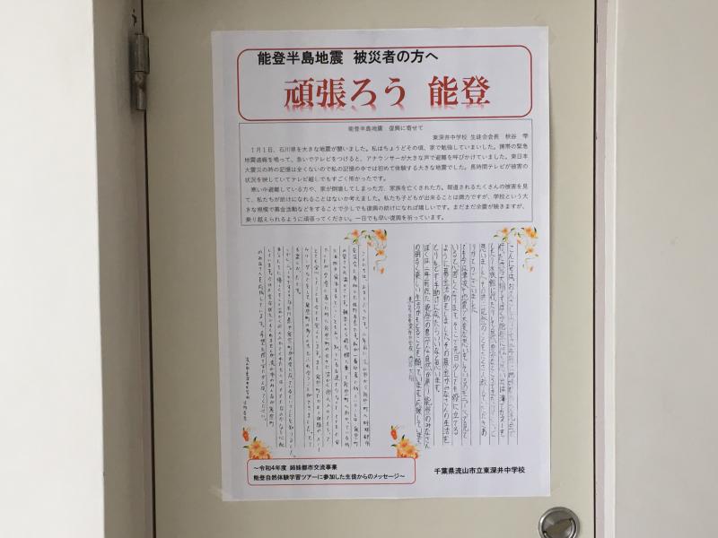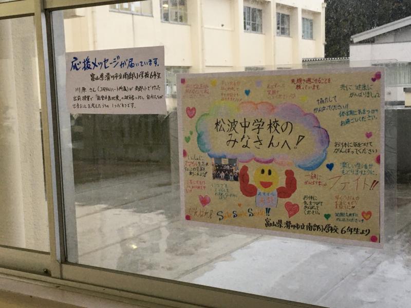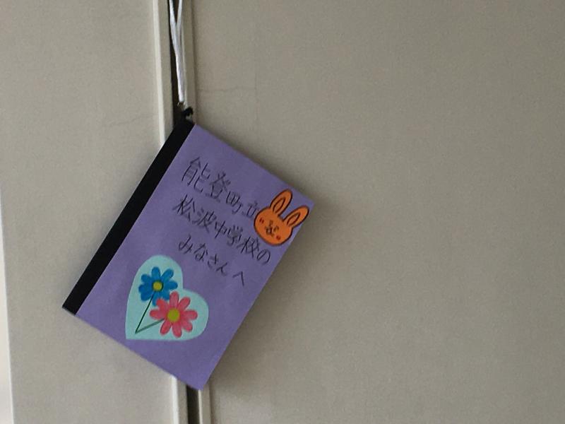 松波中避難所に詰めていただいているジャパンハート(国際医療NGO)所属の川原さんが、富山県滑川市の小学校でおこなった出前授業で、「能登半島地震の被災者に私たちができること」を6年生がいろいろと考えてくれたそうです。「石川県のものを買う」「募金をする」などなど…。そのうちの一つとして、本日応援メッセージが届きました。中学生が毎日通る2階廊下に貼りだしました。