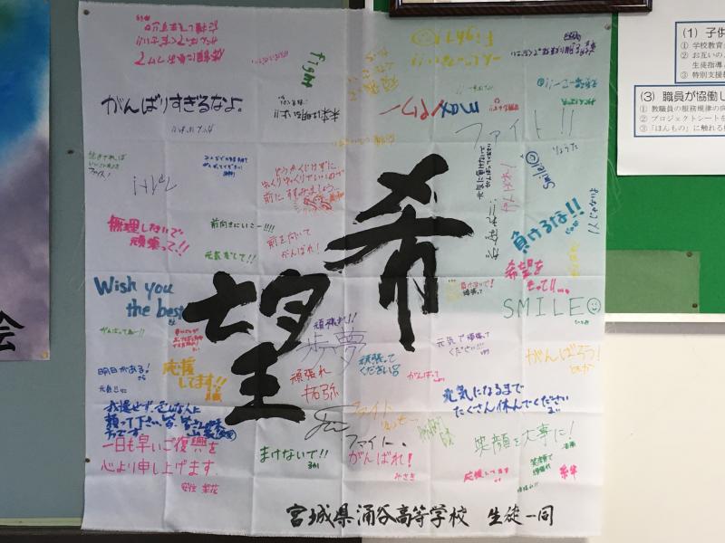 「共に頑張ろう」と題して、辛いことは分かち合い、力を合わせて困難な子の時期を乗り越えていこうというメッセージを寄せ書きしました。1階廊下(以前の1年教室横)に掲示してあります。