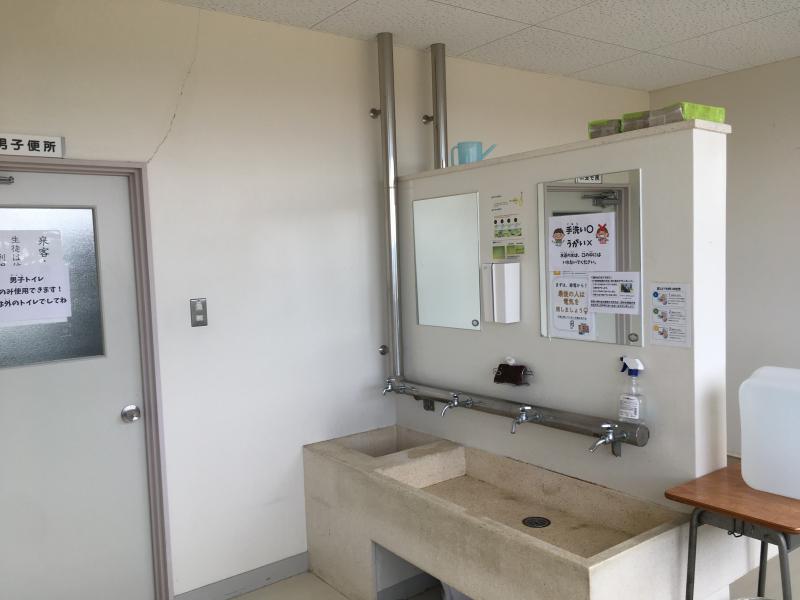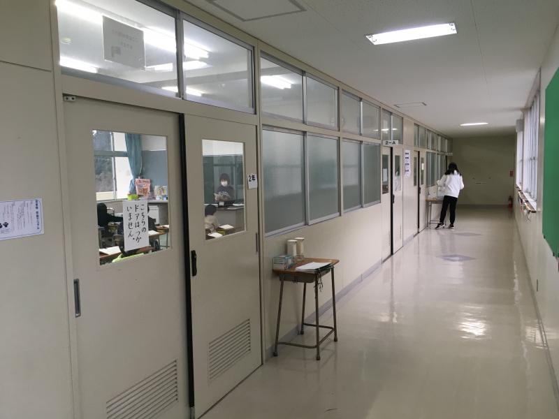小学校2年生と5年生、中学校2年生が2階の教室で勉強しています。小学2年生が3階や玄関先のトイレが遠くて大変という意見を聞いて、グラウンド側の2階トイレを使用できるようにしました。清掃・消毒をして使用開始です。まだ紙は流せませんが、男女とも小用は2階ですみます。手洗いも可です。
