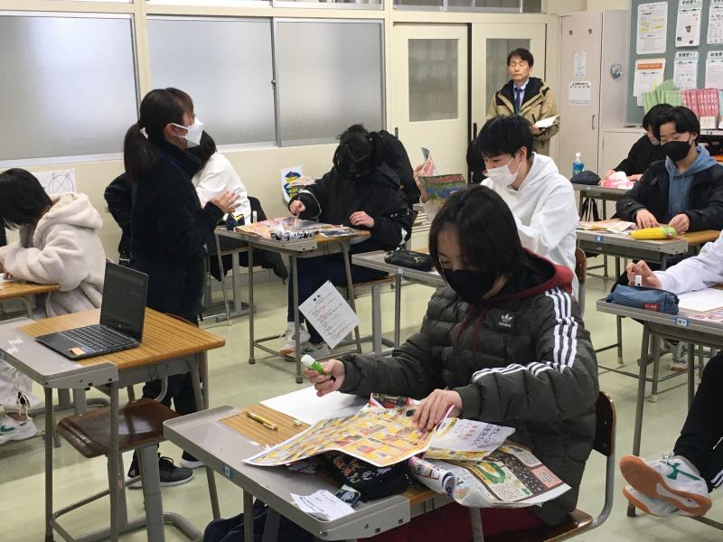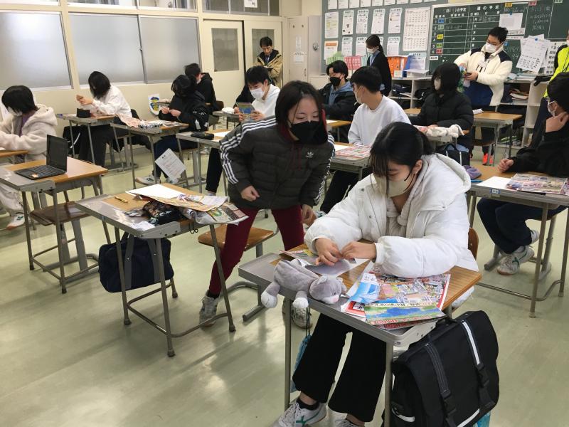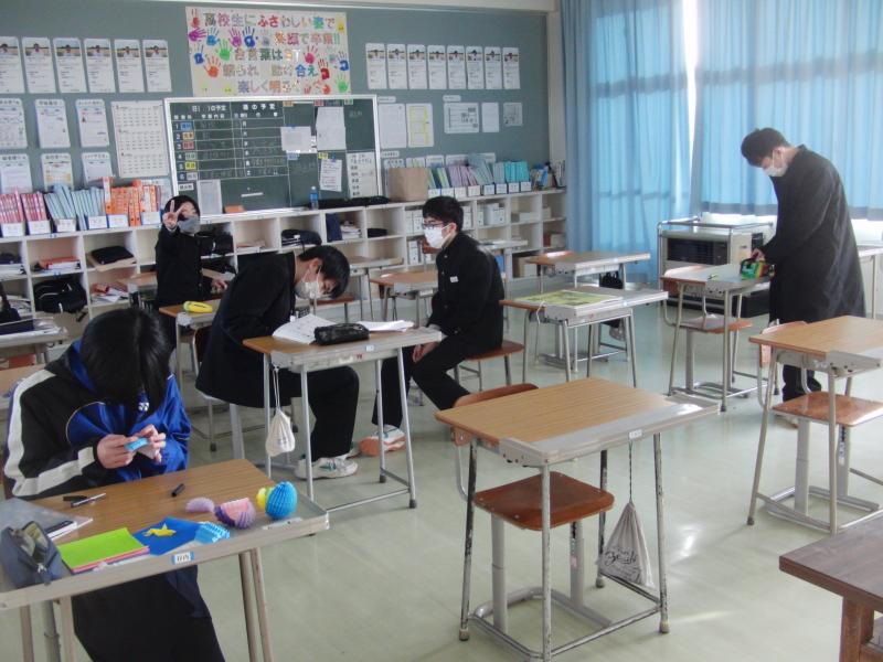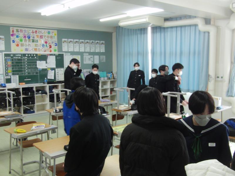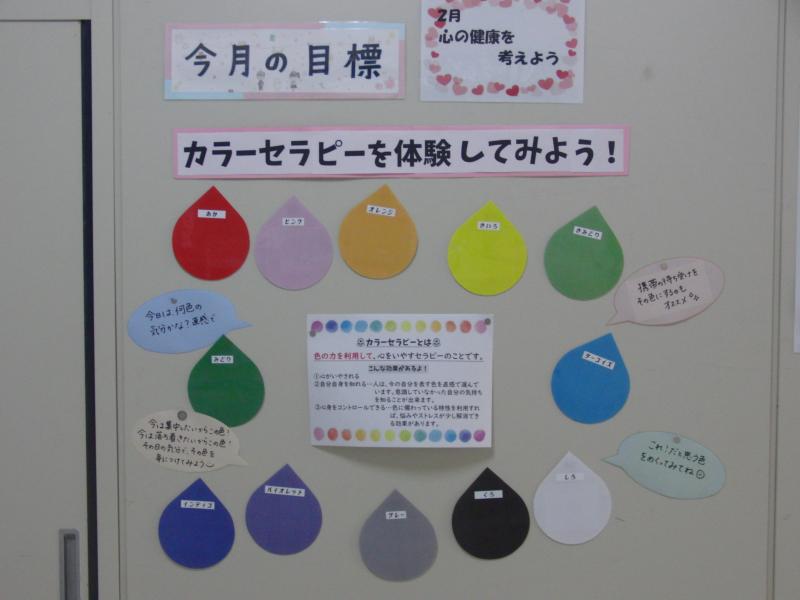 2階保健室前には、心の健康に寄与する「カラーセラピー」があります。今日の気分を色で判断し行動に返します。2年教室前には「制服は必要か…」というお題で話し合った結果が貼りだされています。「必要」とまとめられています。現在は私服登校です。卒業式を1か月後(3月9日)に控え、今後制服登校としていきます。