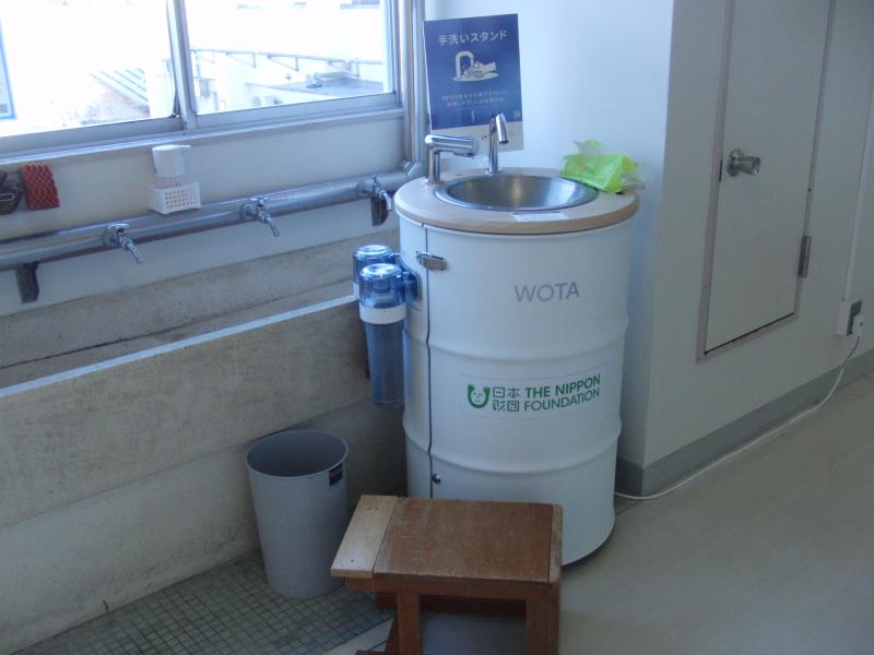 今週から、2階の教室棟は全て学校が使用しています。保健室(小中)、2年生教室、小学校の教室が2つです。玄関先に設置してあった循環型手洗い器を1台、2階の手洗い場に移設しました。