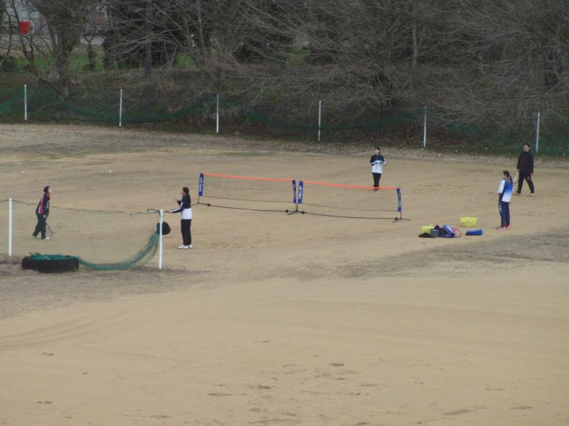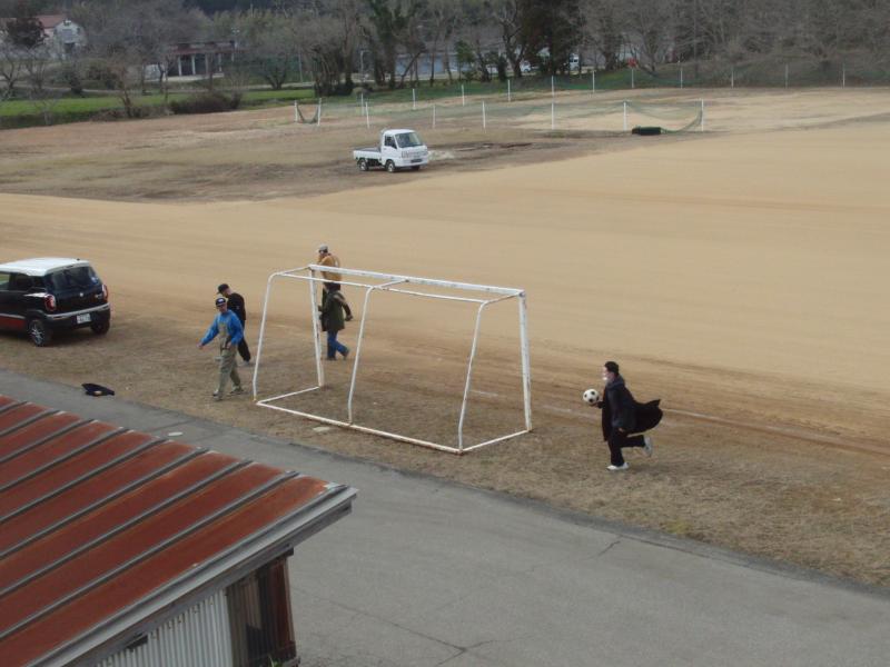 昼休みには、テニスやサッカーに興じる生徒がいました。2年女子はスペースを見つけてテニスのショート乱打、3年男子は震災ボランティアの方々とサッカーをしていました。