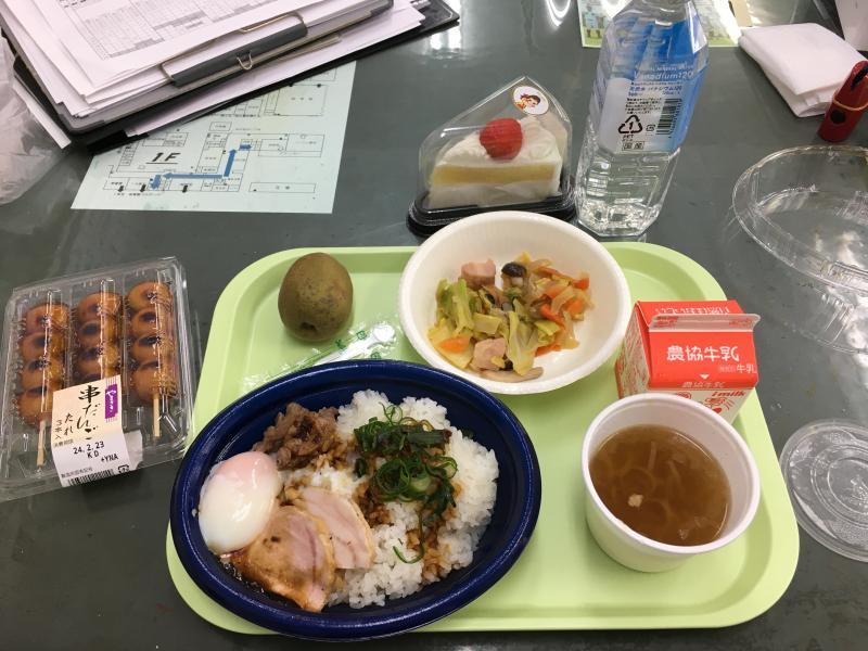 お昼に、オープンジャパンさんによる炊き出しがありました(DELIENTZ株式会社の皆さん、コーディネート:川島さん)。本日は避難所、在宅避難者、学校あわせて450食を学校玄関で調理し配付していただきました。あわせて小中学校には、株式会社不二家さんよりケーキやランチパックのご提供、給食室からも地元食材を利用した野菜炒めがあり、お盆に乗りきらないメニューとなりました。給食室も少しずつ機能を回復しています。