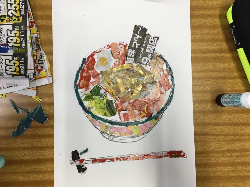 美術では、課題をもって貼り絵に挑戦し、作品を仕上げます。国語の支援員は高校の先生だったので、入試の作文問題に挑戦しました。問題に書いてある「①ことわざ、②具体例、③自分の考え」に加えて④根拠(理由)の4つが解答に必要であることを学び、自分の解答を自己採点し見直していました。