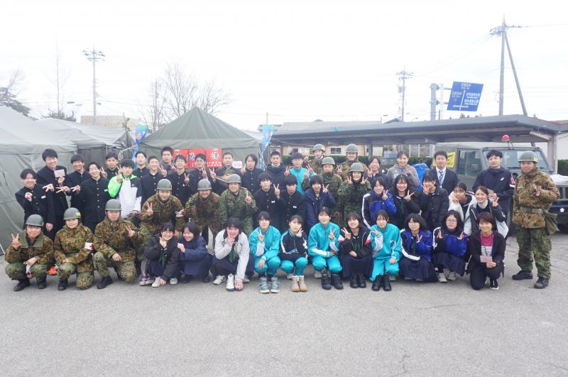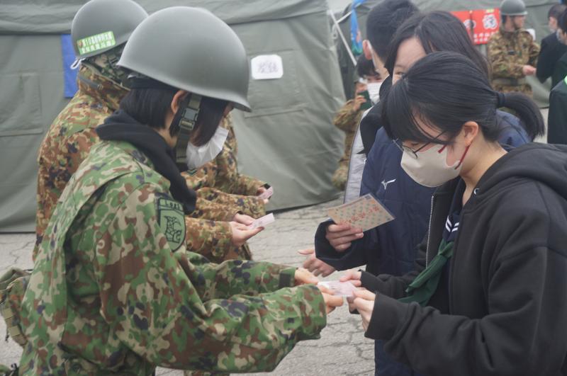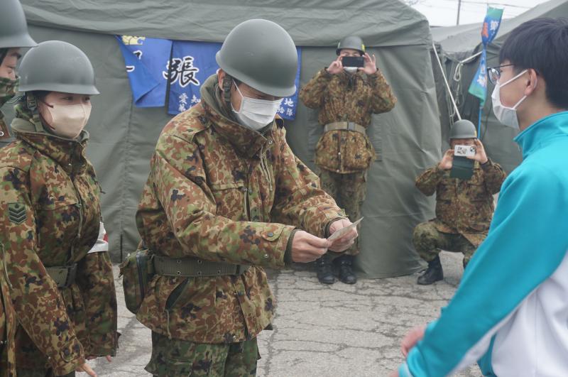 体育館で避難をされている方々には「共に頑張ろう」、入浴支援の自衛隊の皆様には「感謝」のカードを手渡しました。避難者と話し込む中学生も…。解散時には温かい拍手ありがとうございました。自衛隊の方からは「これからも一生懸命やります!」と力強い言葉が…!支援はもちろんのこと、本日はお時間をとっていただきありがとうございます。