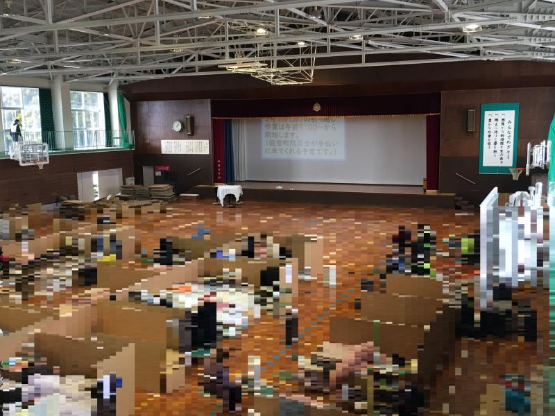 3日(日)午前、避難されている皆様総出で、体育館前半分を空けてくれました。たたんだ段ボールベッドなど残っていますが(一両日中に搬出します)、いよいよ卒業式の会場準備が始まります。くるしい避難生活の中、在所の子どもたちのためにご協力いただきありがとうございます。