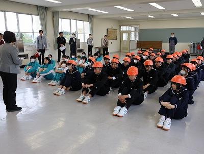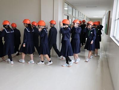 今日、地震や津波を想定した避難訓練を実施しました。自分で自分の身を守ることや余震が起こることも予想して素早くしゃべらずに行動する事などを確認しました。また、町から全校生徒に折り畳み式のヘルメットが今年度配布されたので、避難する際にかぶって行動してみました。(1年生には後日配布される予定です)全校生徒、一人もしゃべらず真剣に訓練に取り組んでいました。