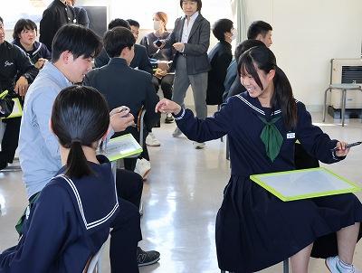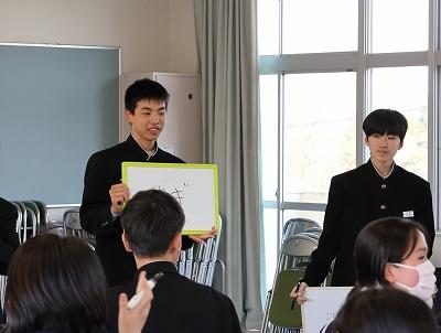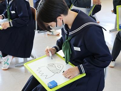 「全校生徒がつながる」ことを目標に、生徒会執行部が中心となって企画運営し、全校生徒でレクレーションをしました。第1回目の内容は「お絵描き伝言ゲーム」です。新しい先生も入り、テーマに沿った絵を描いて「絵」を次の人に伝えていき、最後の人は言葉でテーマを答えるのですが、なかなか最後の人まで伝えることが難しい!!1回目のテーマは「ドラ〇〇もん」だったので、全チーム正解。その後はなかなか苦戦していたチームもありましたが、作戦会議を開いたり、描く順番を変えたりして、楽しみながら活動していました。話したことがない人と話す、良い機会になったと思います。