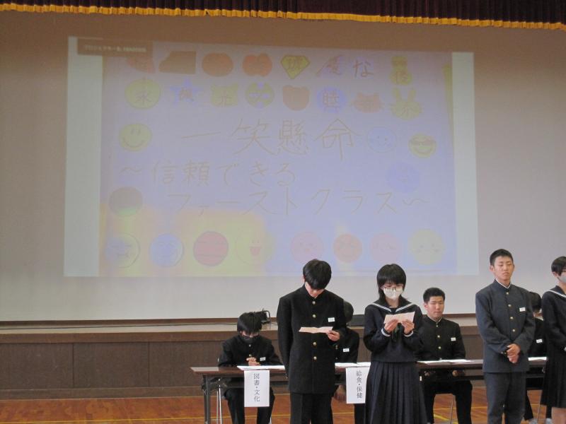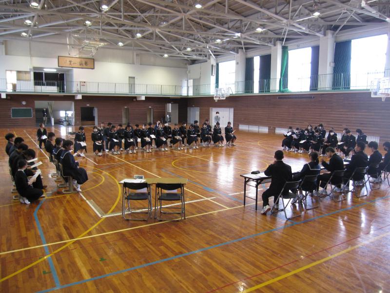 奥能登大会、全能登陸上大会に向け、全校で激励会を行いました。生徒会が主催し、事前に1年生には3年生が一緒に応援歌や校歌の練習をするなど全員で取り組んできました。今日の本番は、各部のキャプテンが、大会に向けての抱負を力強く発表し、たくさんの拍手をもらっていました。生徒会長からの激励の言葉の後、全員で校歌と応援歌「銀波たたえる」「緑にはゆる」を歌い、互いの健闘を祈りました。これまでで一番大きな声でした!!