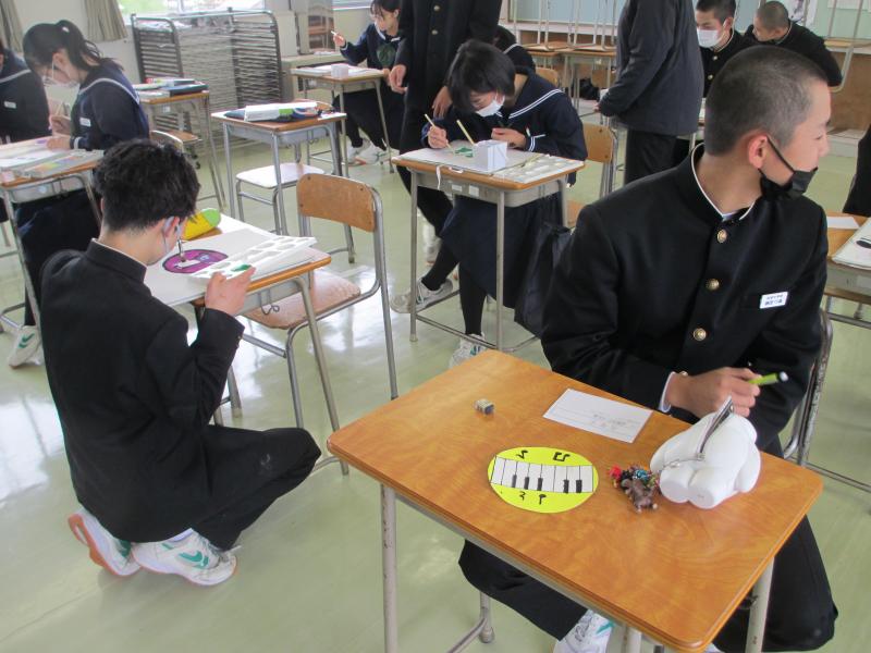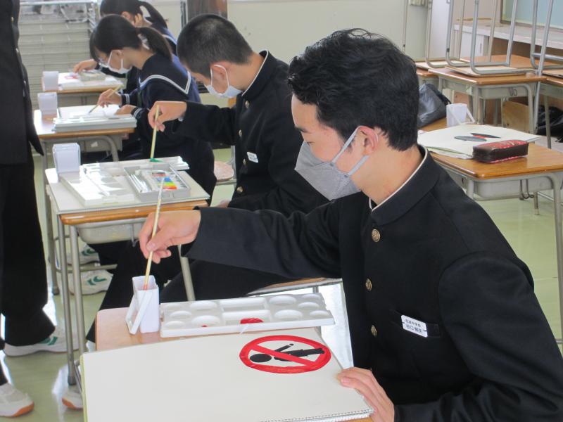 3年生は、連休前から継続となるピクトグラム制作です。学校内の案内を目的とするピクトグラムです。生徒の制作の様子からその意味する場所を当てて下さい。
