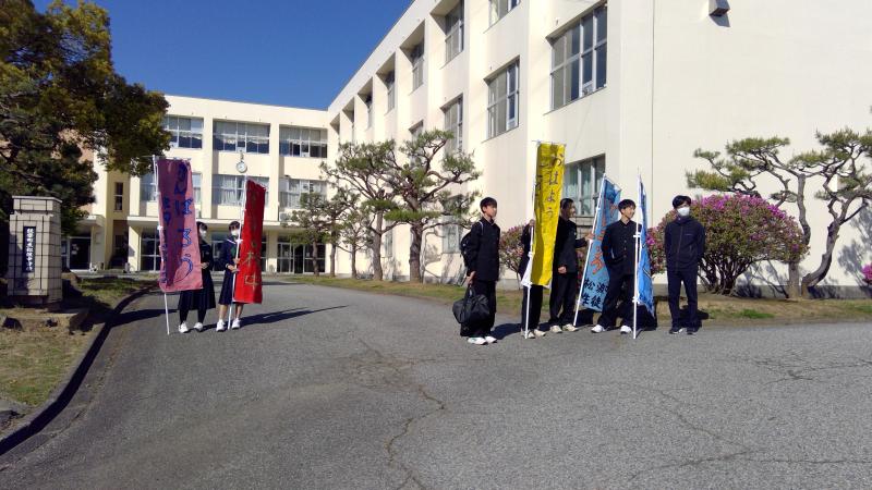 本日より、春の全国交通安全運動2023(~5/20)が実施されています。それに合わせて、生徒会執行部が手作りののぼり旗を手に、校門前であいさつ運動を始めました。大きな声は校舎裏まで聞こえていました。のぼり旗には手書きの懐かしい雰囲気で「目指せあいさつ日本一」や「あいさつの松中」といった文字が書かれており、生徒会の意気込みも伝わってきます。今後は、帰りの時刻のあいさつ運動にも取り組みたいとのことでした。めざせ日本一!