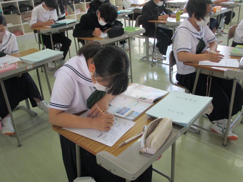 2時間目までに中間テストも終わり、教科の授業が再開しています。本日は和田教諭担当の授業から、2年生の家庭と1年生の数学の授業の様子です。