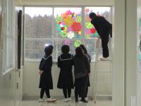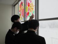 3年生が,2Fの窓ガラスにステンドグラス風の作品を張り上げました。暖色系のグループと寒色系のグループが,それぞれ協同してデザイン・制作にあたっています。