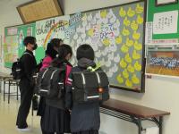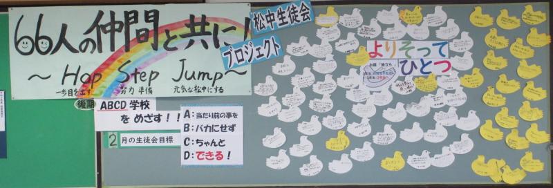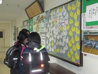 生徒会が今年度1年間継続してきた『よりそってひとつ』プロジェクトもいよいよ最終回となりました。お題は「旅立ち」。卒業生から在校生・先生へ,在校生・先生から卒業生へのメッセージがそろいました。帰宅前の3年生が足をとめて見入っていました。