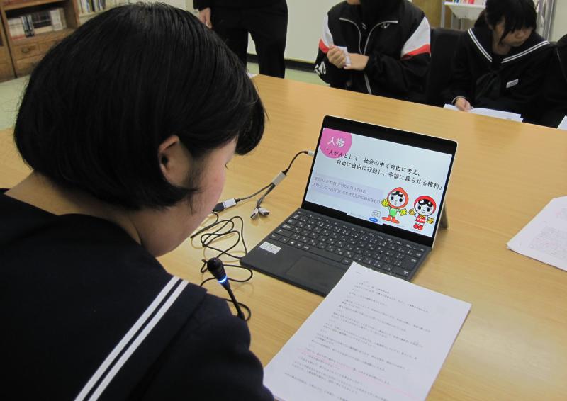 図書文化委員会が企画し、自分の人権を守り、他者の人権を守ろうとする意識・意欲・態度を身につけることをめあてに、人権集会(読み聞かせ)を行いました。人権週間について伝えた後、昨年度の全国人権作文コンクール入選作品を読み、身の回りにある人権について考える機会になりました。