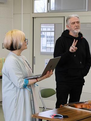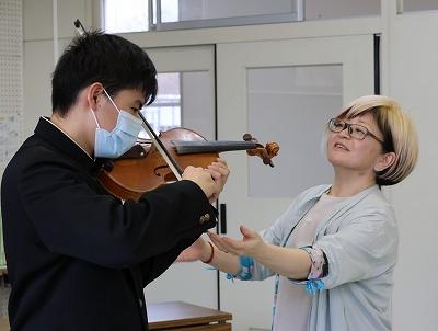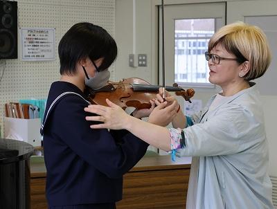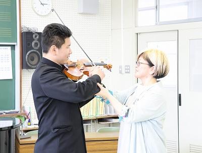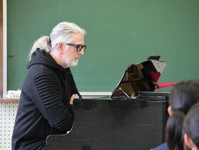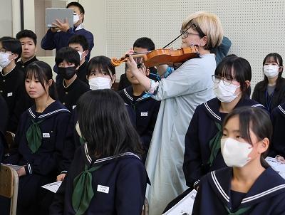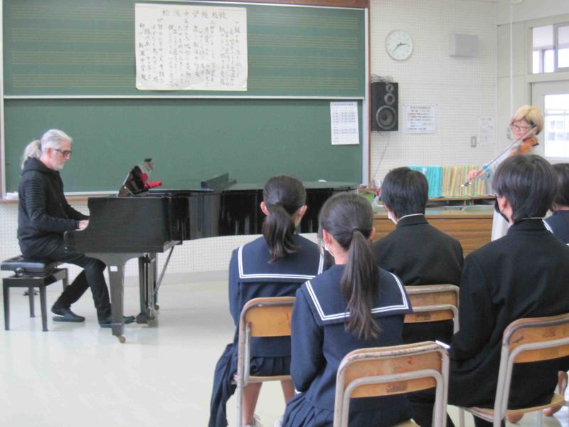 本日、6限目に「アーティストによる、教育プロジェクト~子どもたちに本物を~」をテーマに、ピアニストのスティーブン スモールさんとヴァイオリニストの鹿嶋 静さん、能登町に拠点を置き、支援活動をされている岩城 ひろこさんをお招きし、演奏とキャリアトークをしていただきました。生の演奏を聞く機会が少ないので、まずその音色の美しさに感動しました。また、鹿嶋さんのヴァイオリンを貸していただき、希望者が演奏体験をしました。音楽で気持ちが安らいだ後は、プロの音楽家になった道のりや「夢をかなえるために大事なこと」などについてお話を聞きました。あっという間の50分間でした!ありがとうございました。